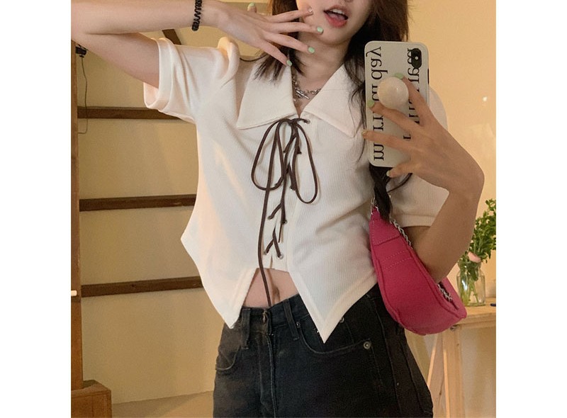 设计感绑带式上衣短袖Polo领t恤女夏季小众别致短款正肩外穿上衣