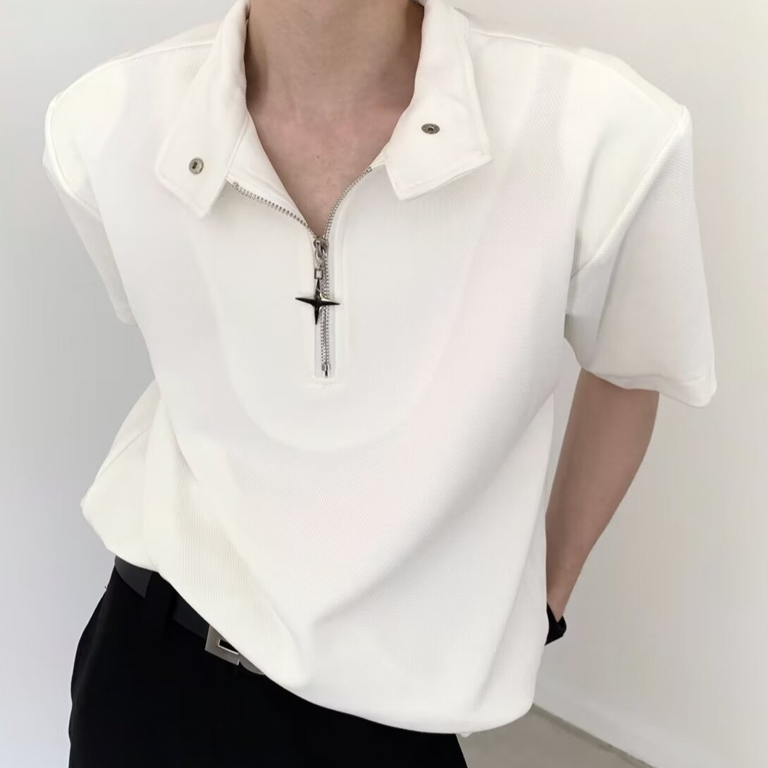 白色高级感立领金属拉链polo衫男士夏季潮牌设计感宽松短袖T恤衫