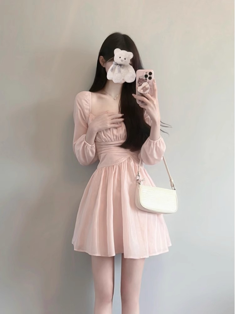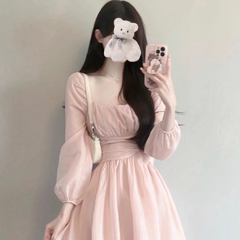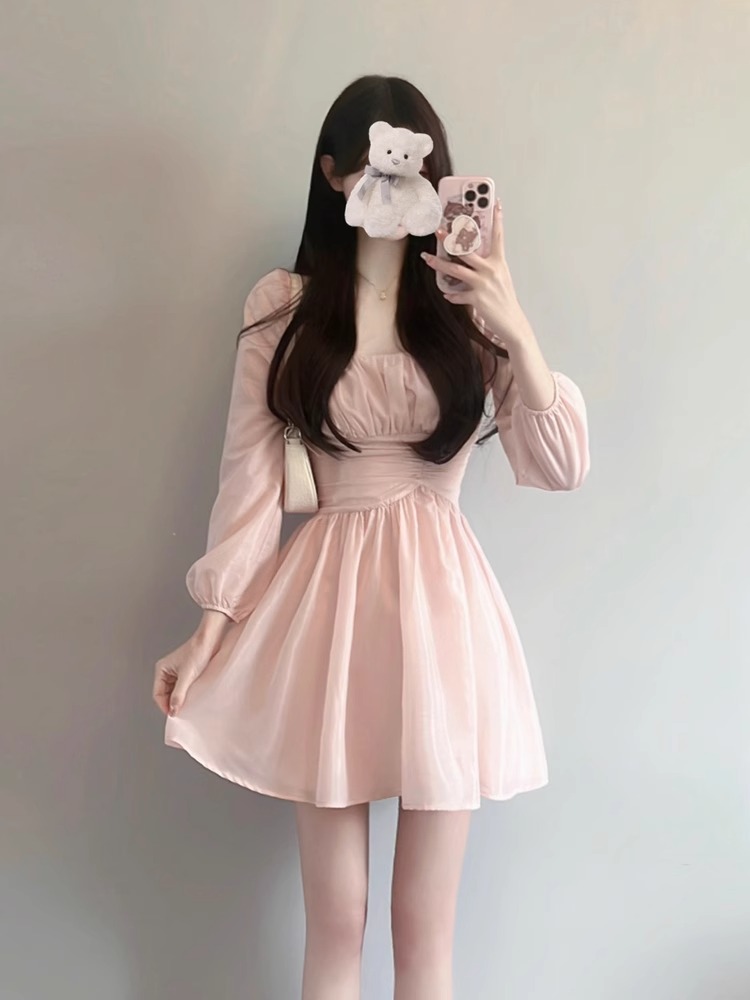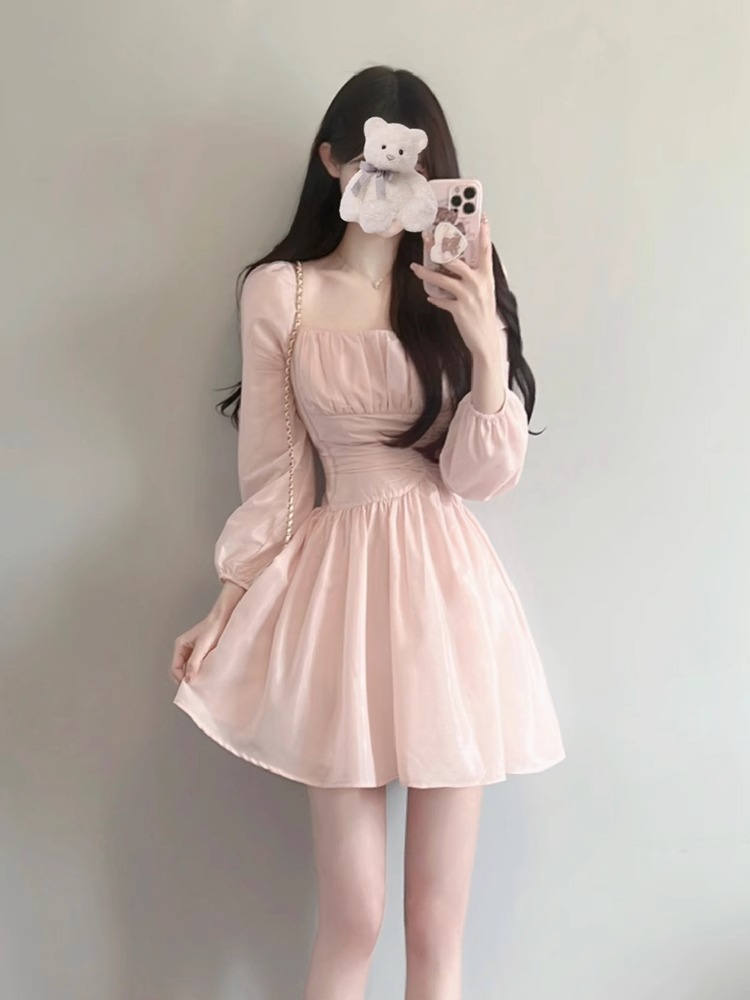 茶歇法式初恋奶系穿搭小个子高级感收腰显瘦短款方领连衣裙女秋季
