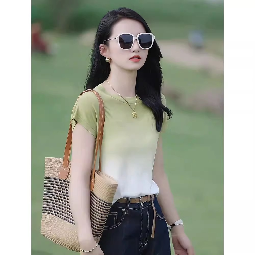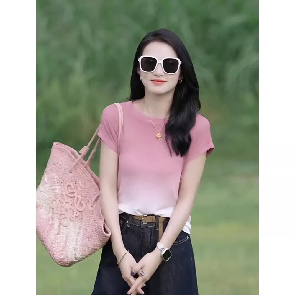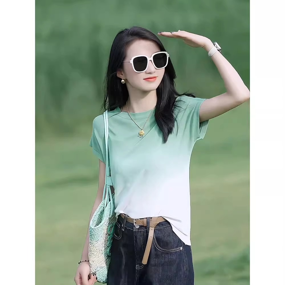 渐变色冰丝短袖t恤女2025新款夏薄款圆领显瘦时尚百搭设计感上衣