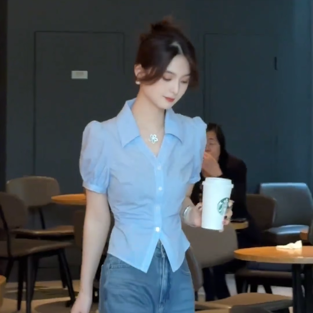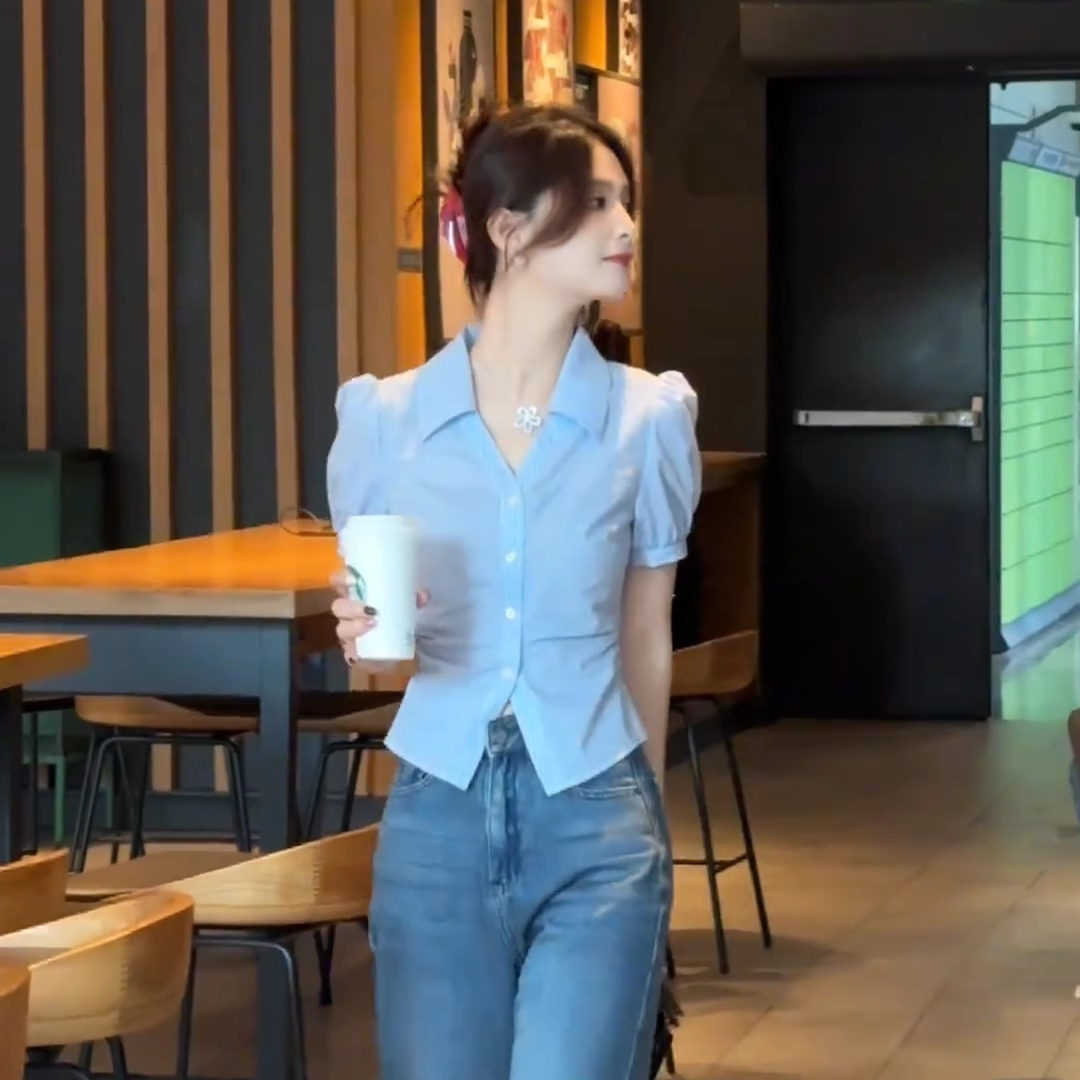 韩系polo领蓝色短袖衬衫女夏季收腰设计感短款衬衣别致超好看上衣