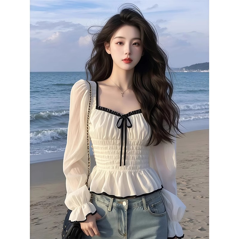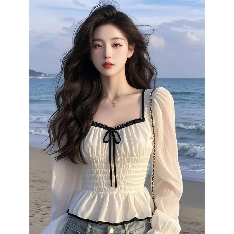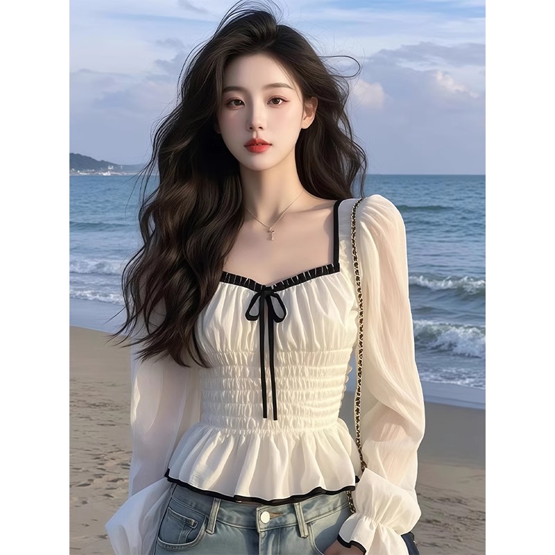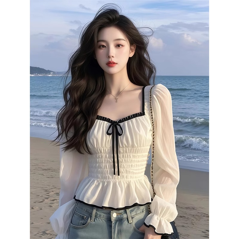 超好看长袖衬衫女2025年新款爆款小衫高级感收腰法式方领短款上衣