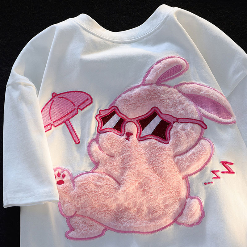 甜美可爱纯棉植绒小兔子短袖男女夏季新款情侣宽松百搭上衣T恤潮