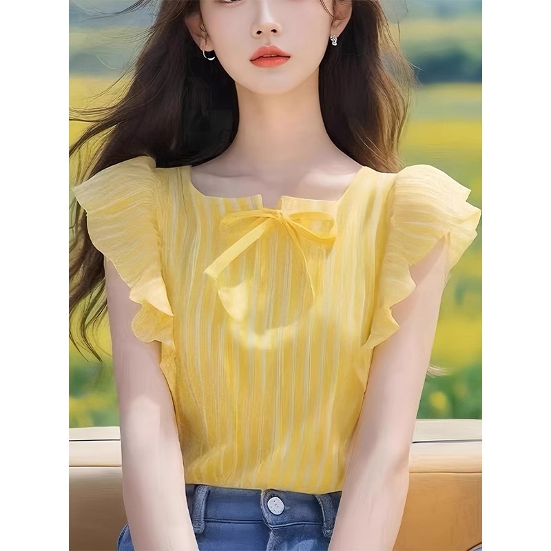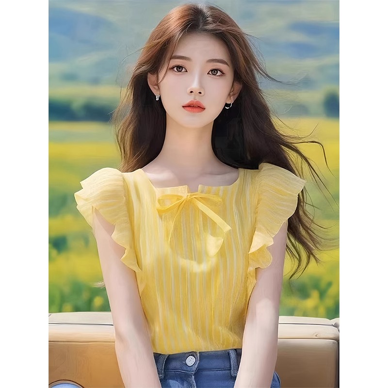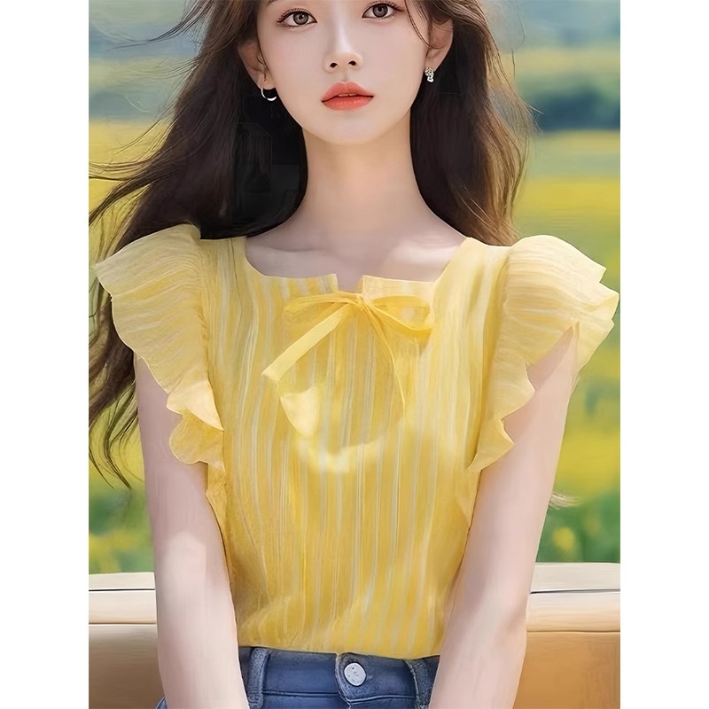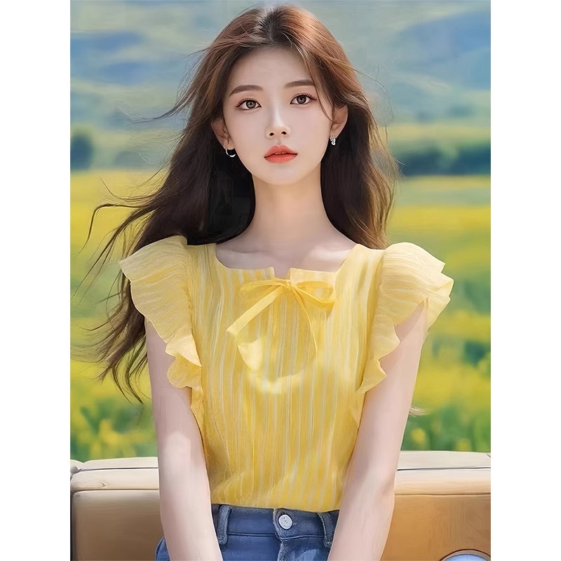 黄色条纹短袖衬衫女2025新款夏季气质小衫法式独特别致小飞袖上衣