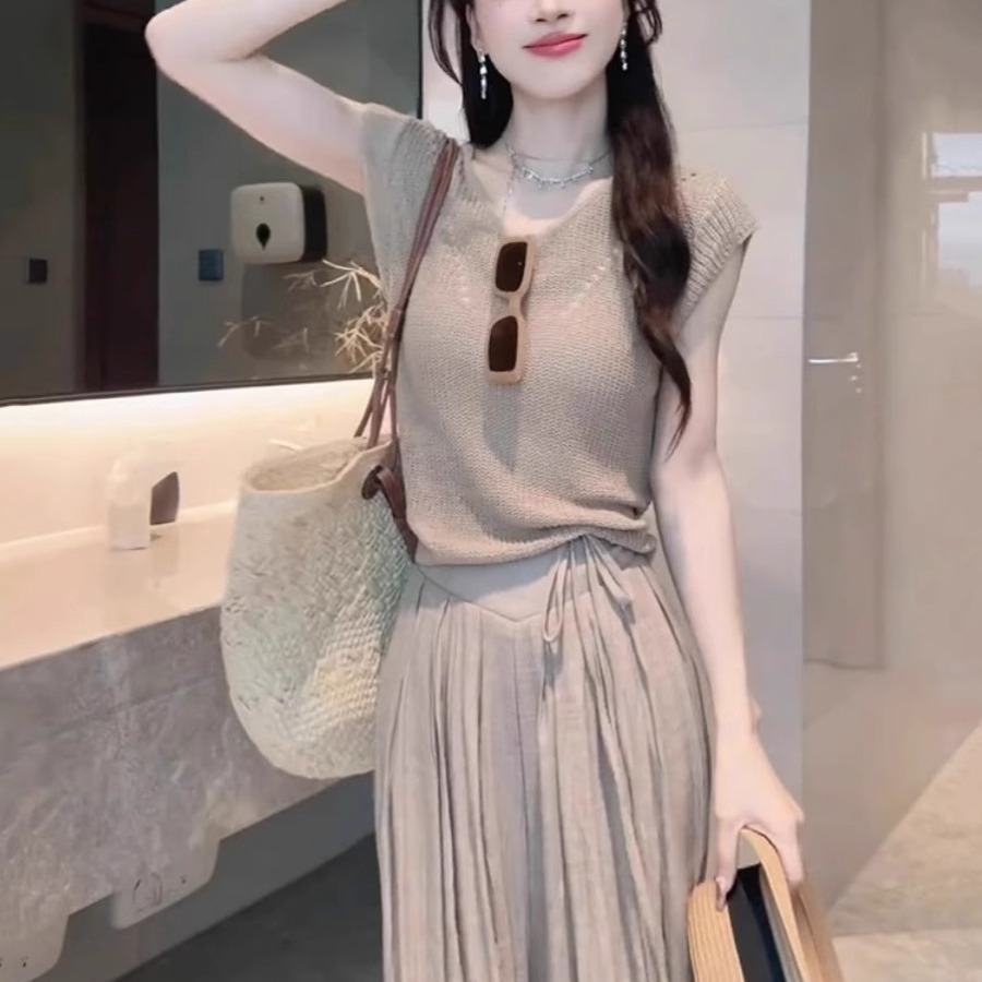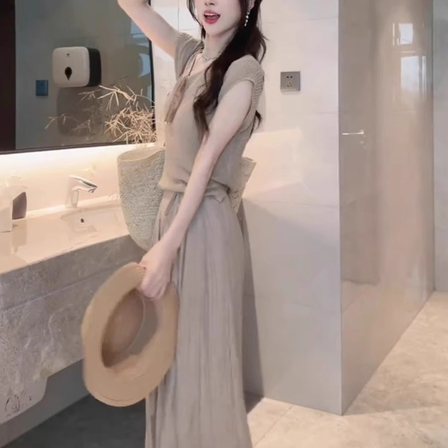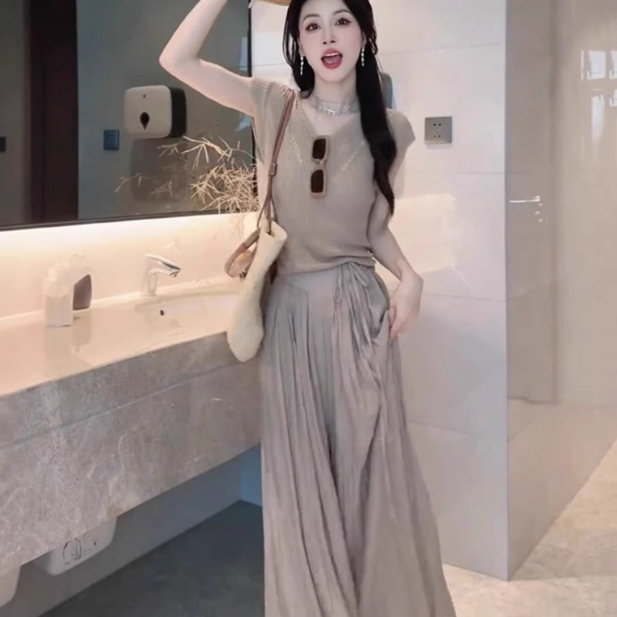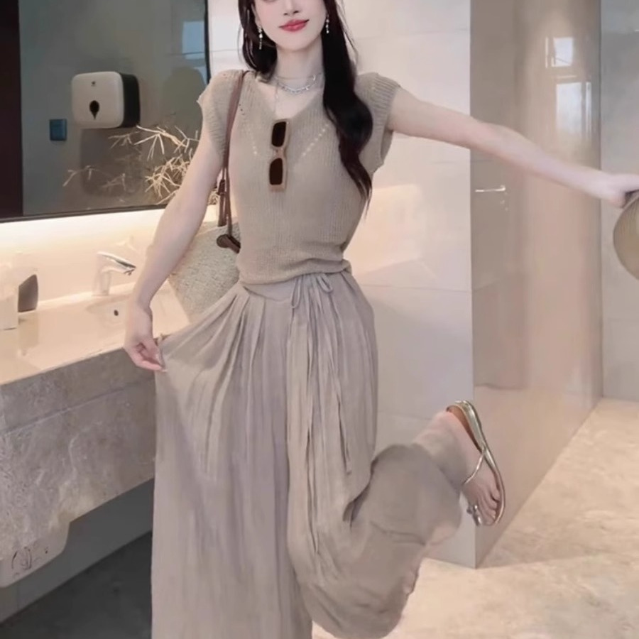 夏装搭配茶系穿搭一整套小个子减龄漂亮洋气休闲阔腿裤两件套装女