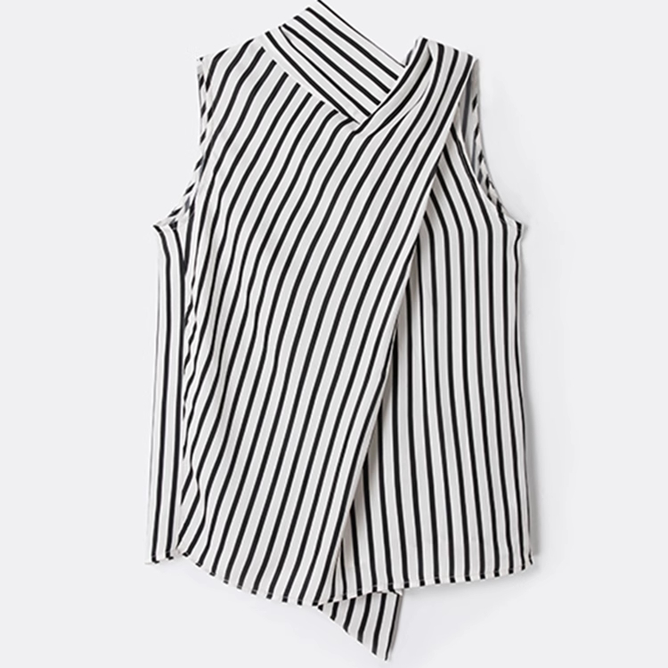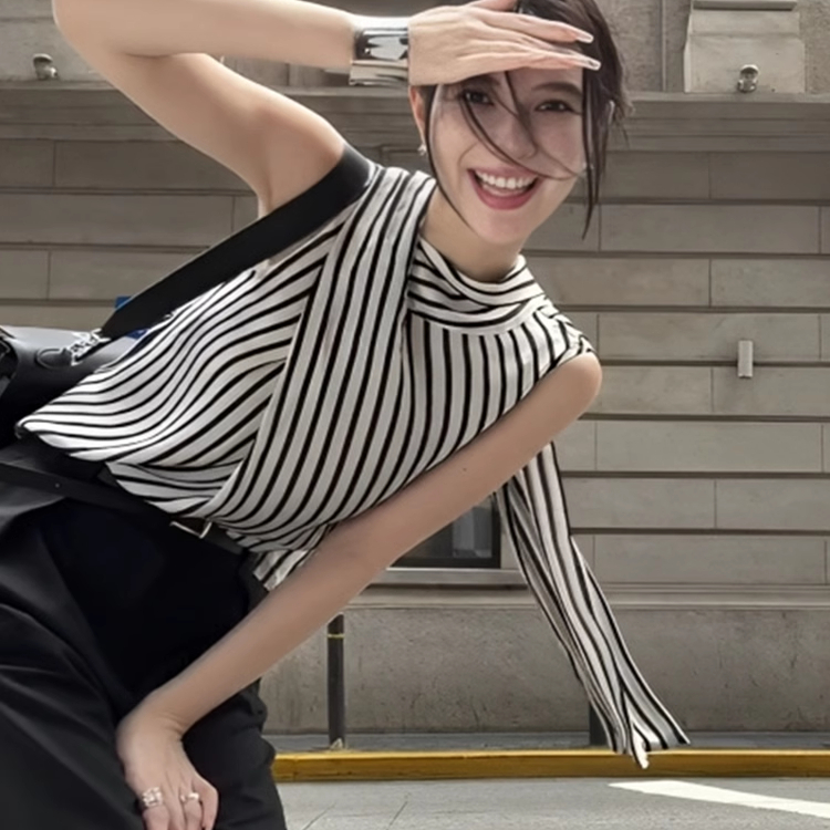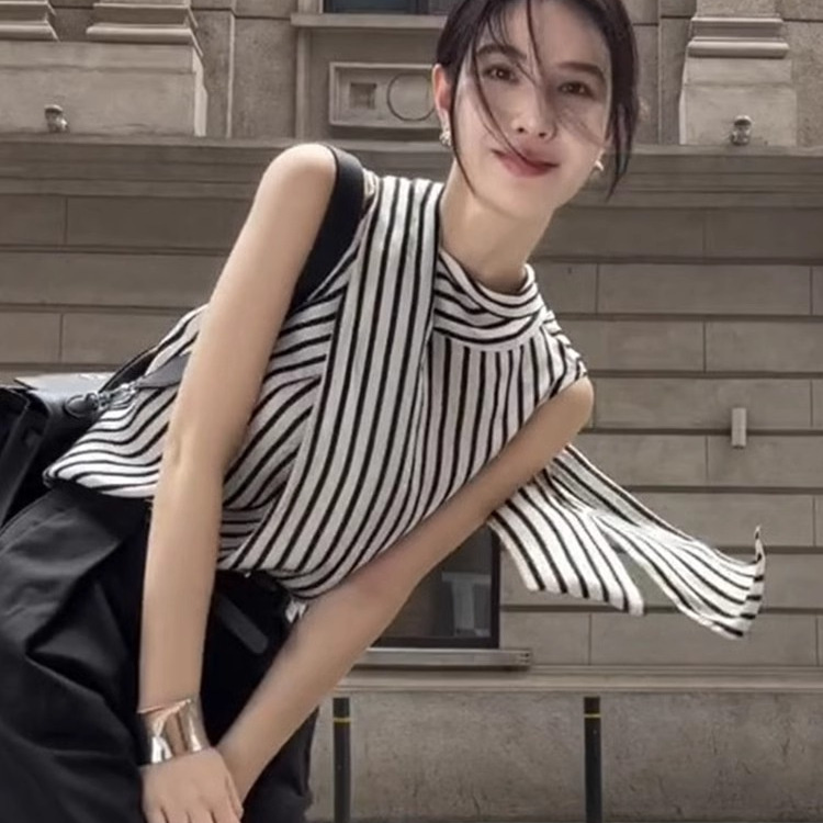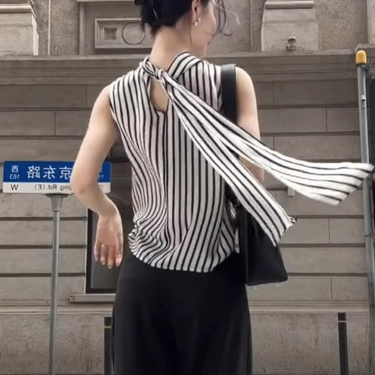 法式轻奢高级感无袖条纹衬衫女夏季新款小众气质飘带宽松显瘦上衣
