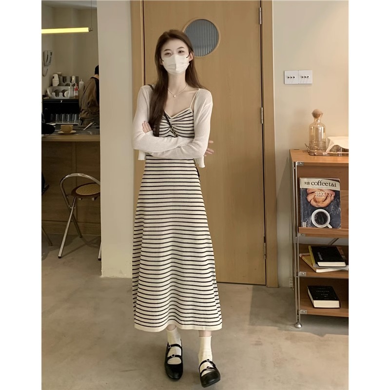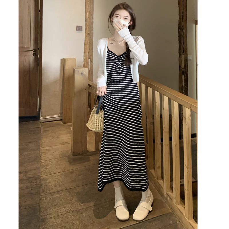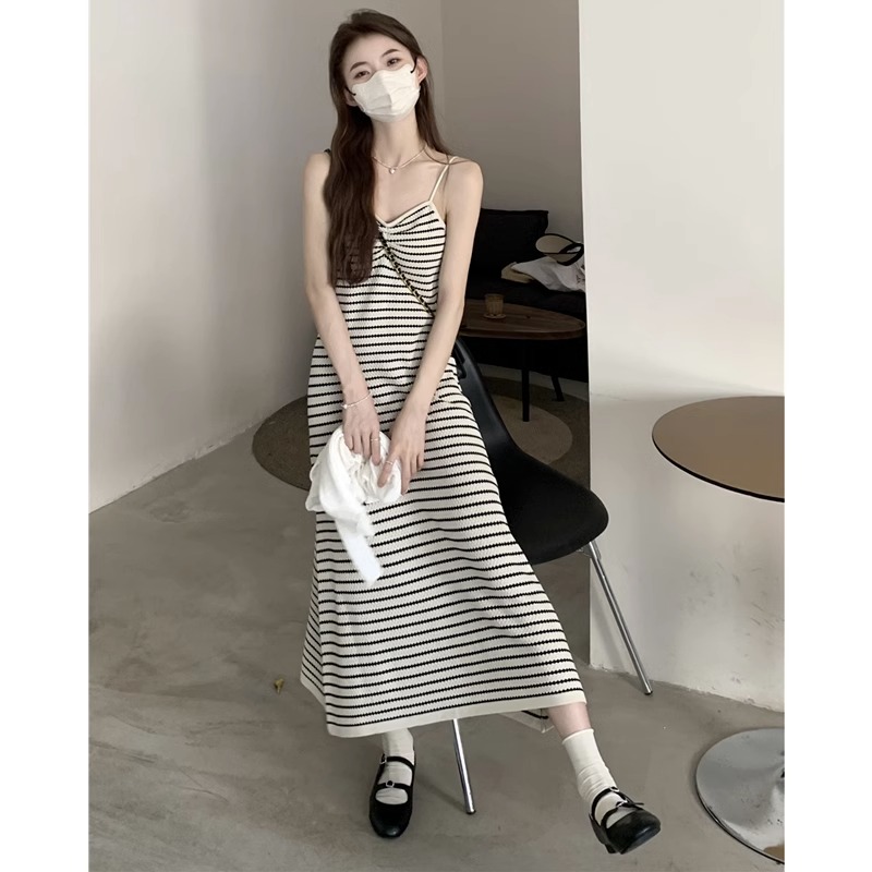 韩系撞色针织条纹吊带连衣裙女夏季宽松直筒显瘦长裙纯欲高级感