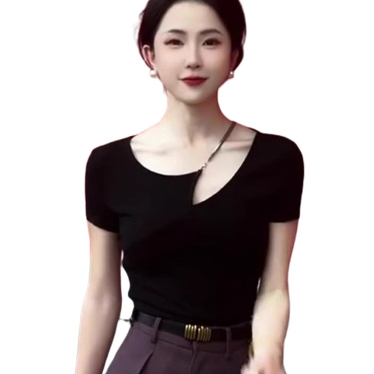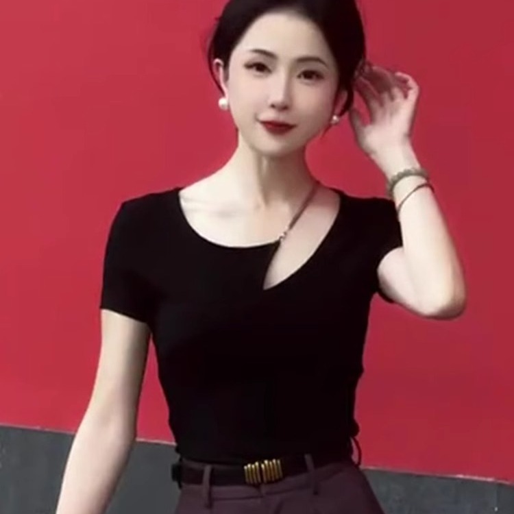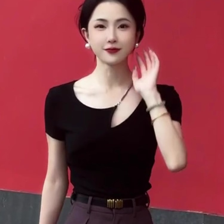 黑色露肩短袖t恤女2025新款夏季时尚时髦修身独特别致绝美小上衣