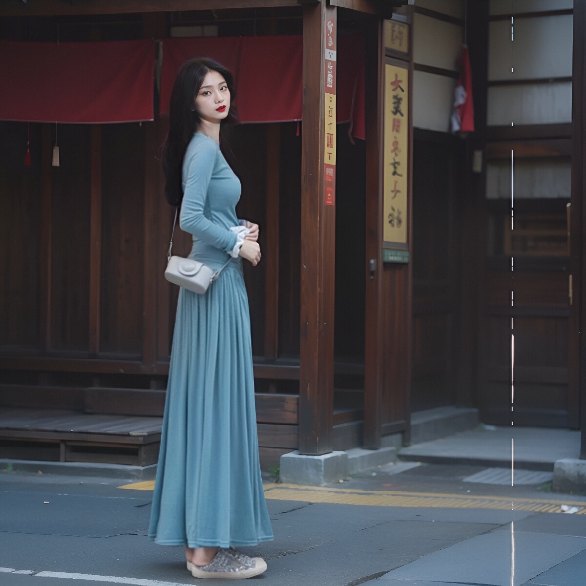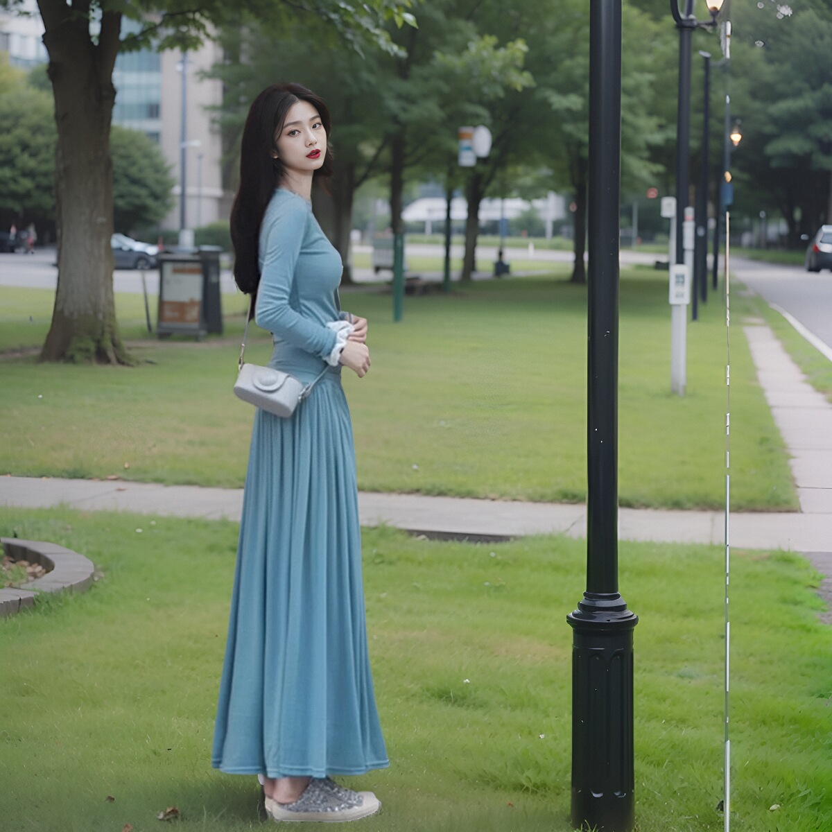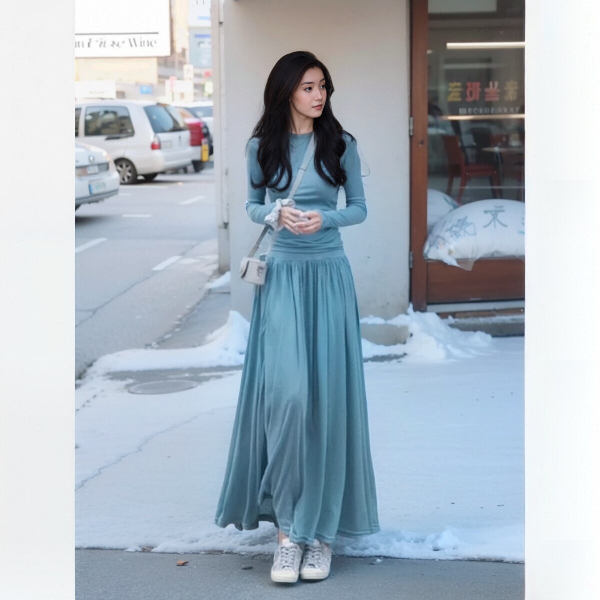新款早秋韩系穿搭超仙时尚洋气蓝色长袖T恤半身裙两件套装女