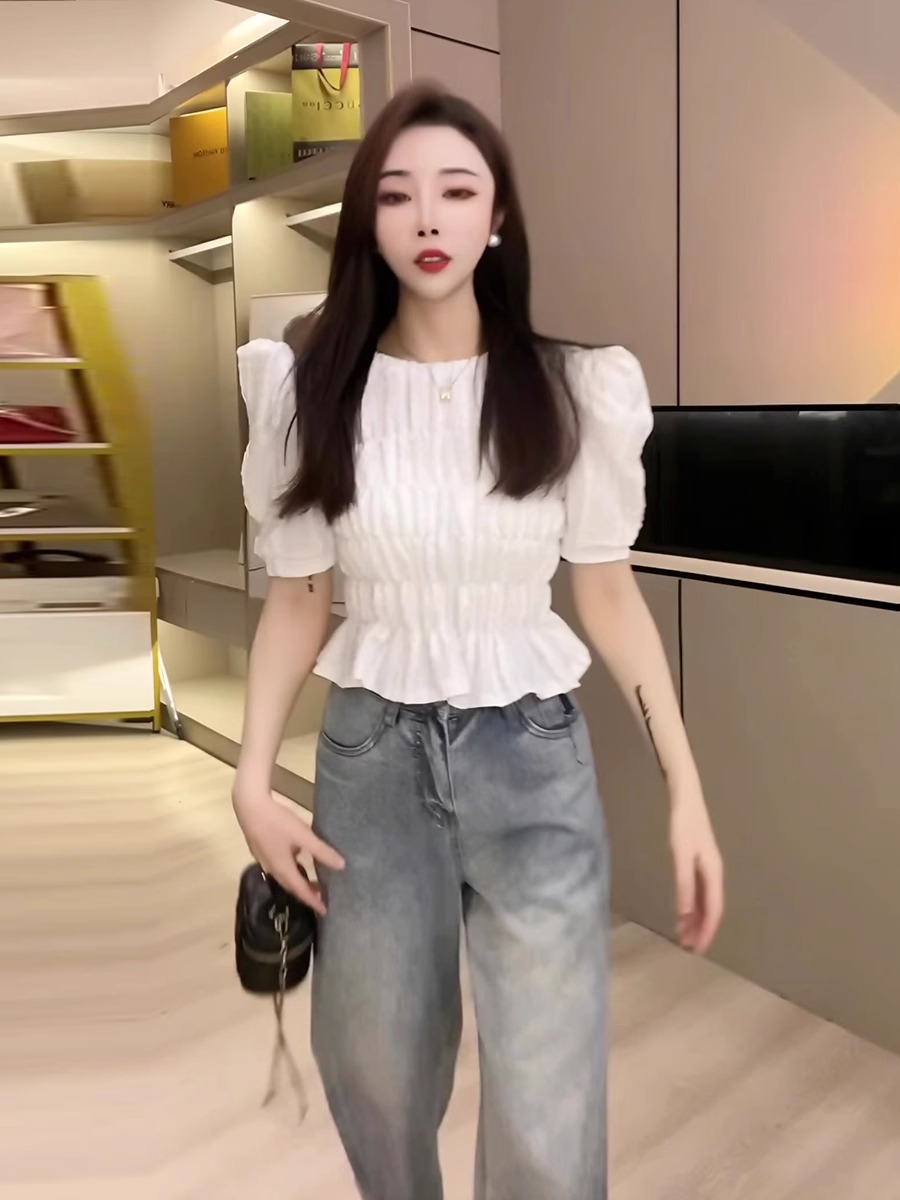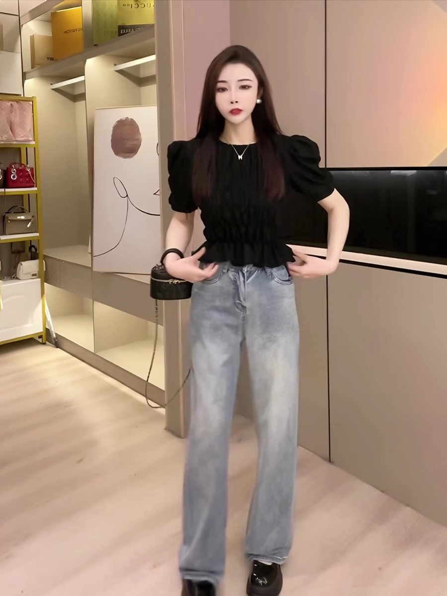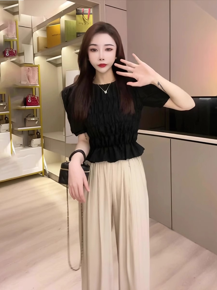 韩系chic小众设计高级感黑色皱褶衬衫上衣女夏别致独特泡泡袖小衫