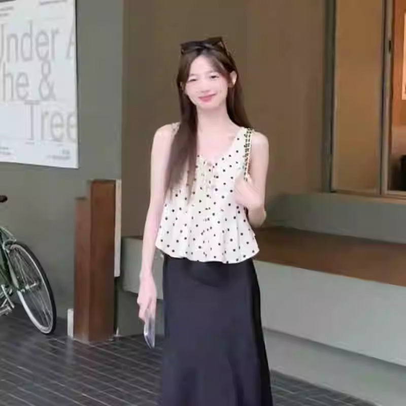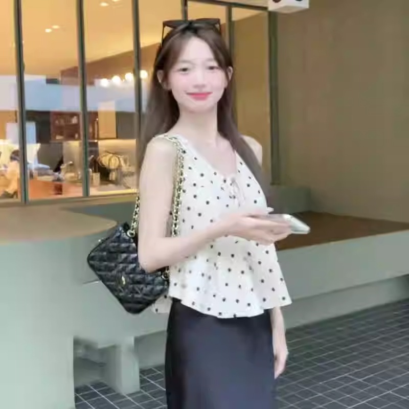 法式V领波点无袖衬衫女夏季独特别致娃娃衫独特别致显瘦背心上衣