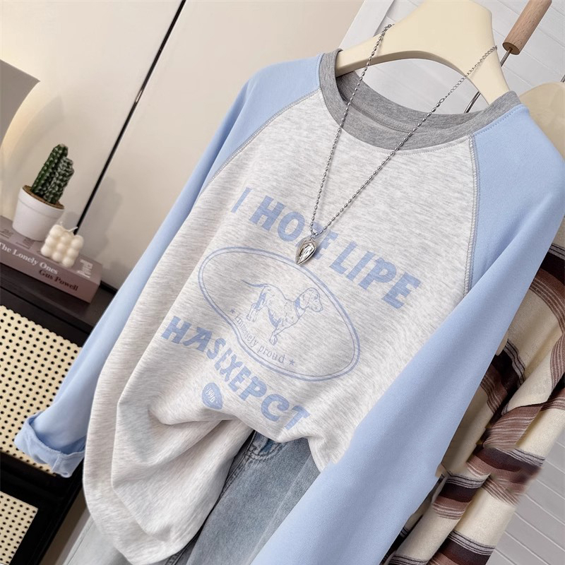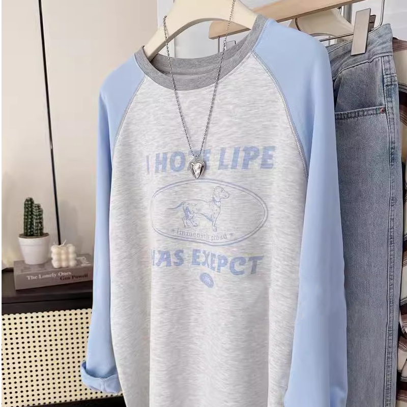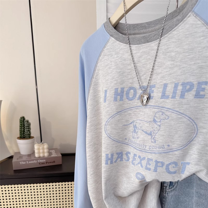 甜美小个子多巴胺小狗印花插肩长袖T恤女春秋新款宽松显瘦上衣服