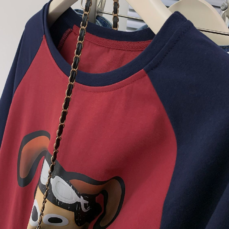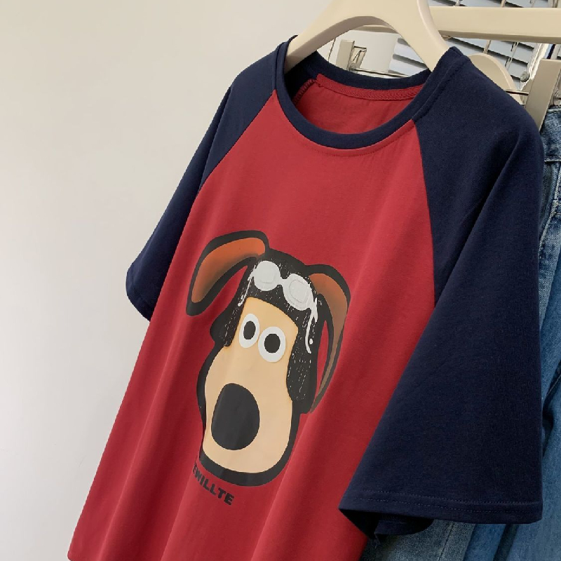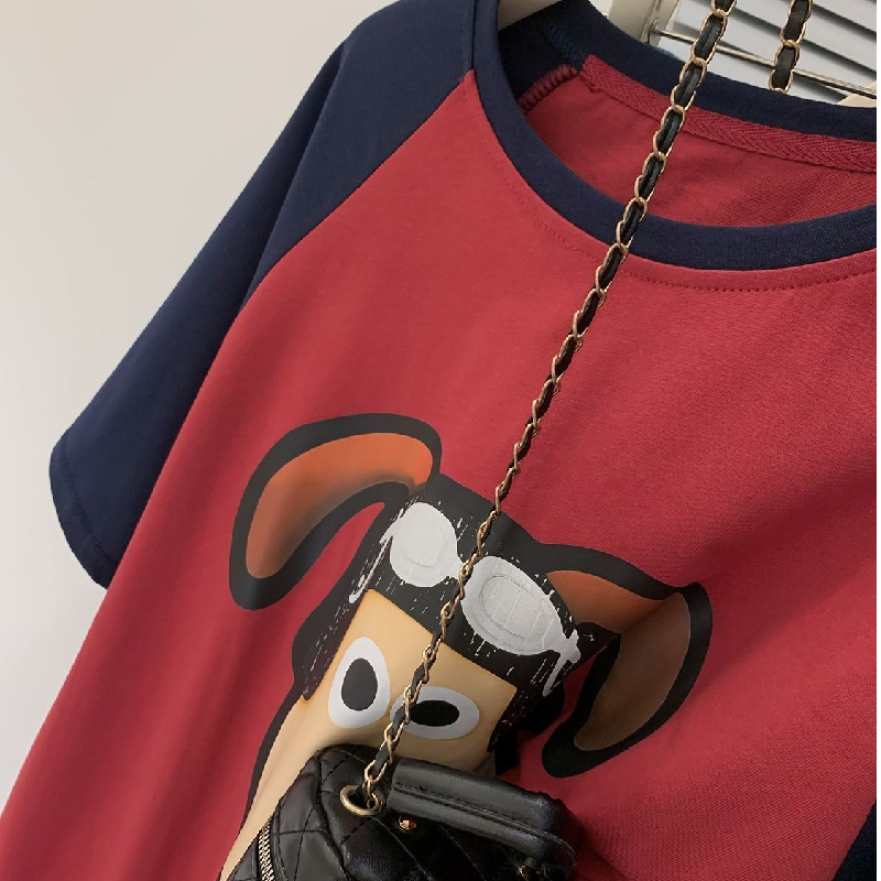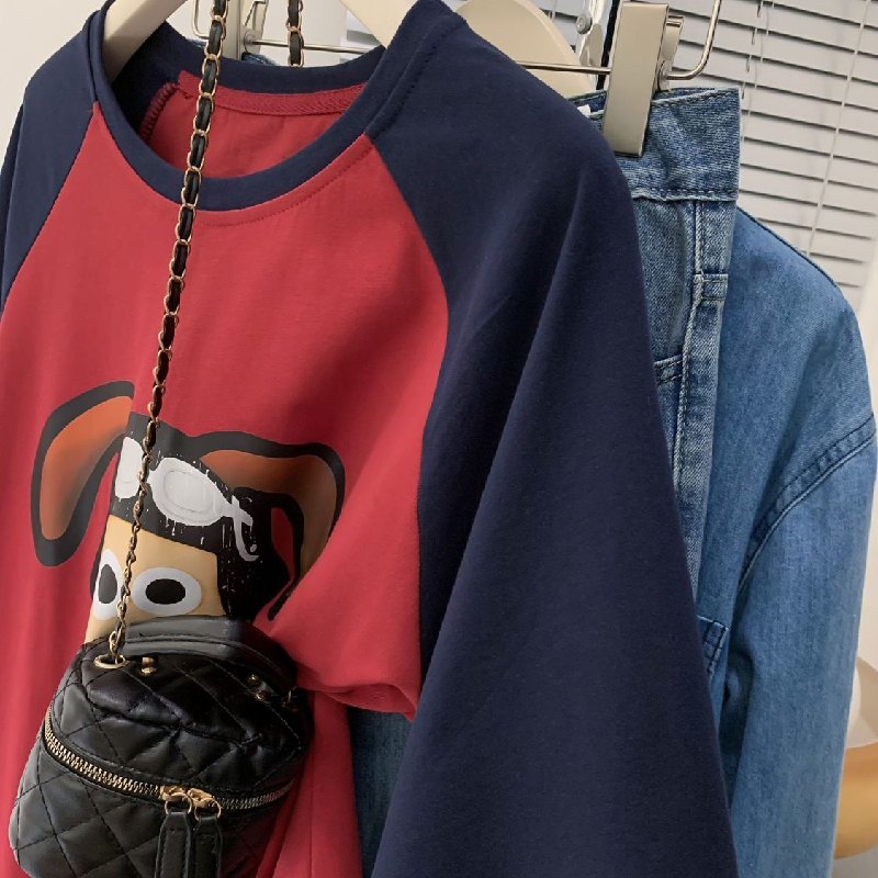 小个子撞色插肩袖印花短袖T恤女夏季新款设计感宽松休闲百搭上衣