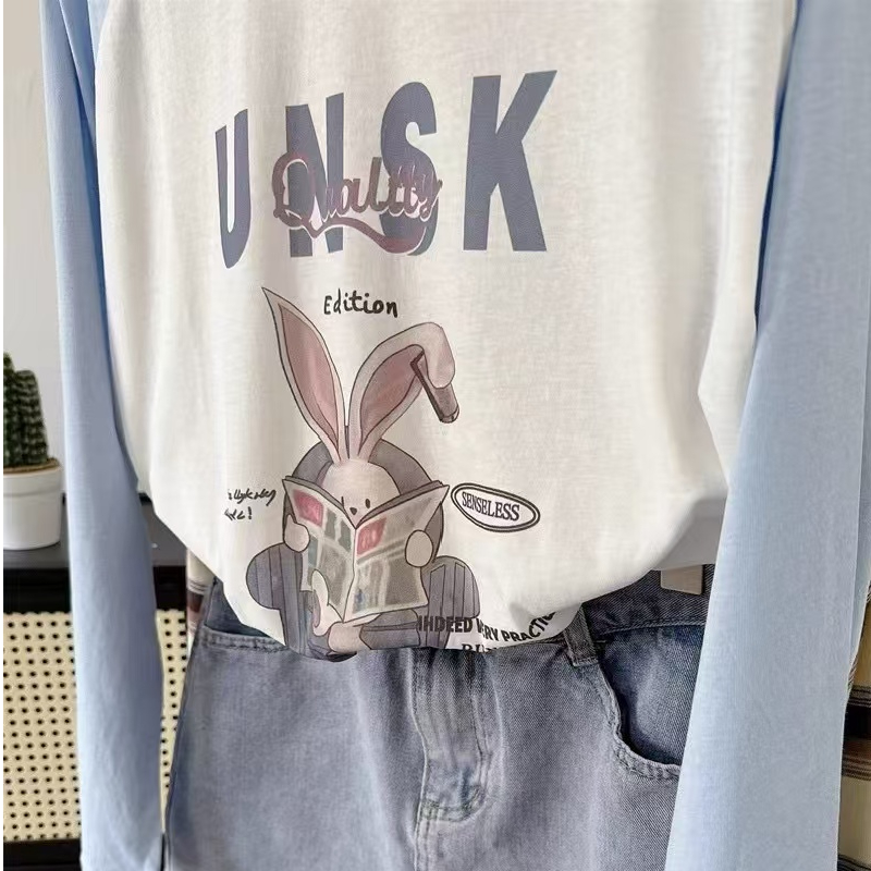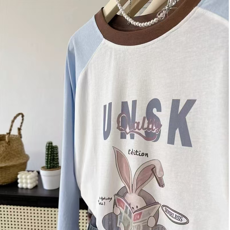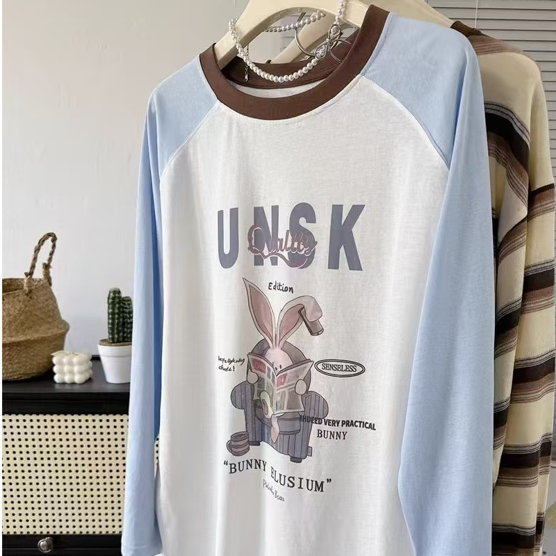 春季新款韩版宽松百搭插肩袖兔子印花长袖T恤女宽松显瘦薄款上衣
