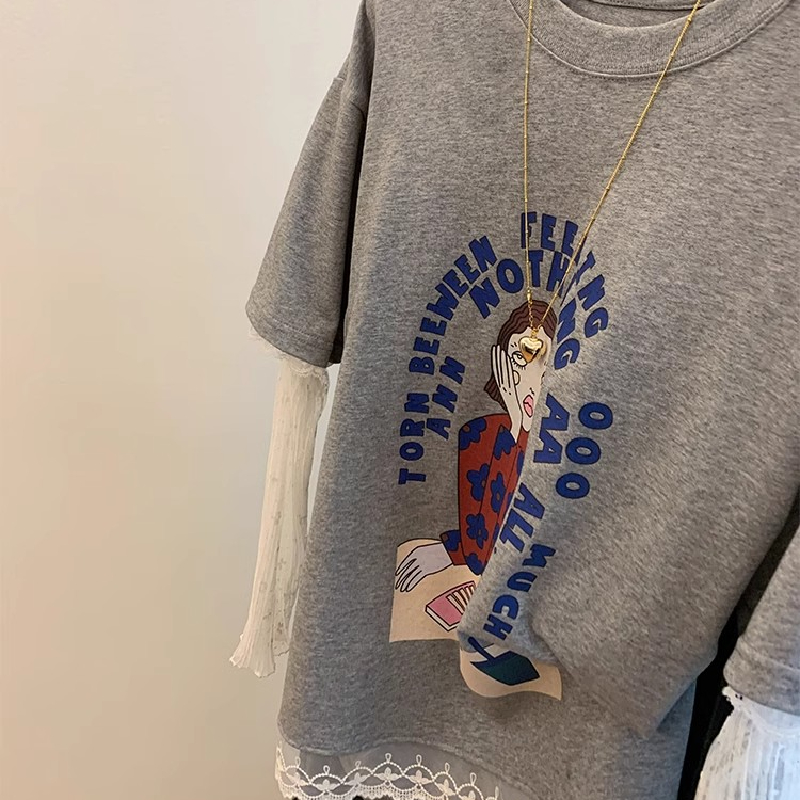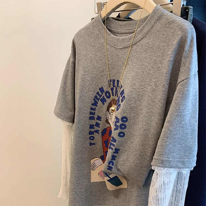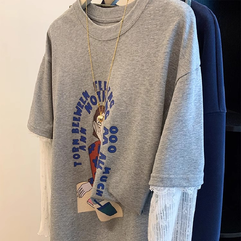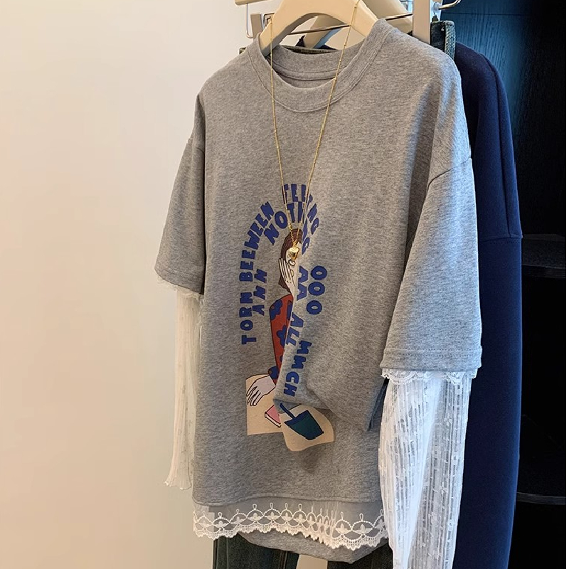 甜系大码蕾丝花边拼接长袖t恤女夏季假两件防晒宽松显瘦上衣打底