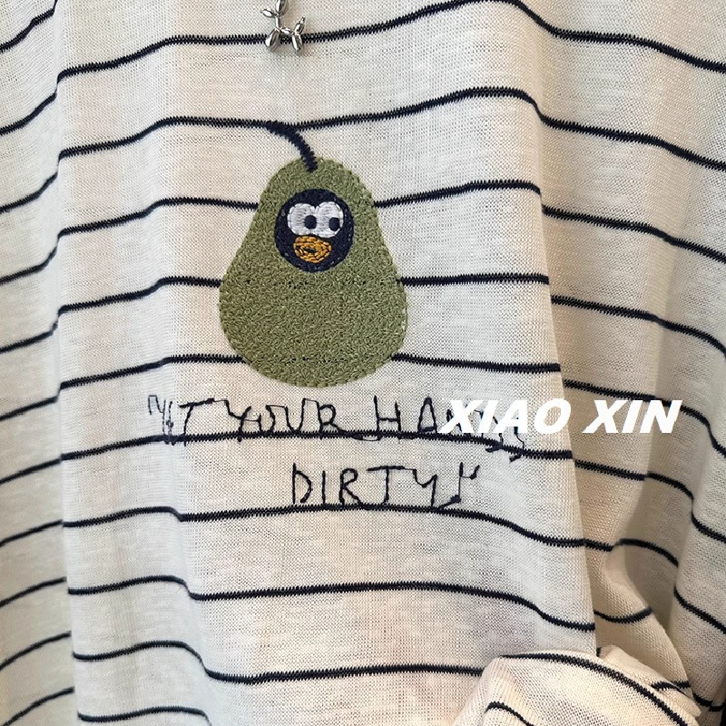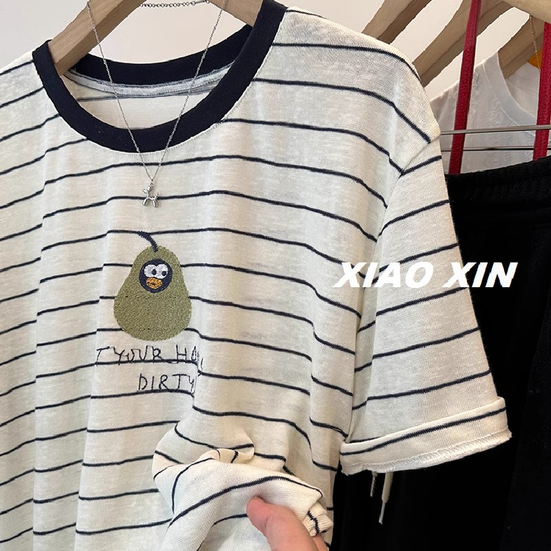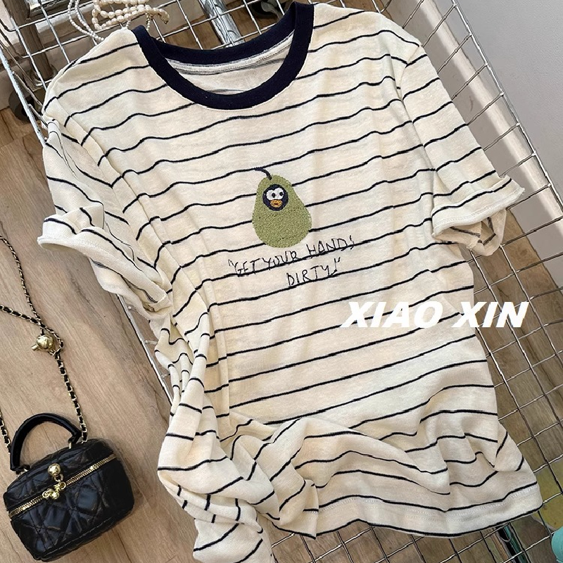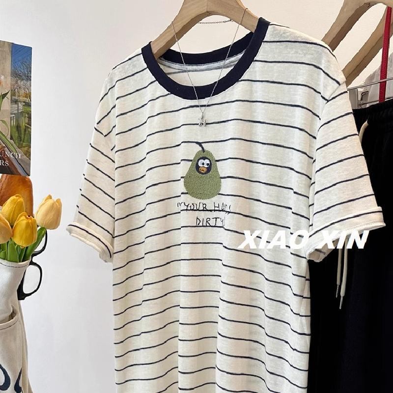 美式复古企鹅青梨印花薄款条纹短袖T恤女夏季舒适透气休闲上衣服