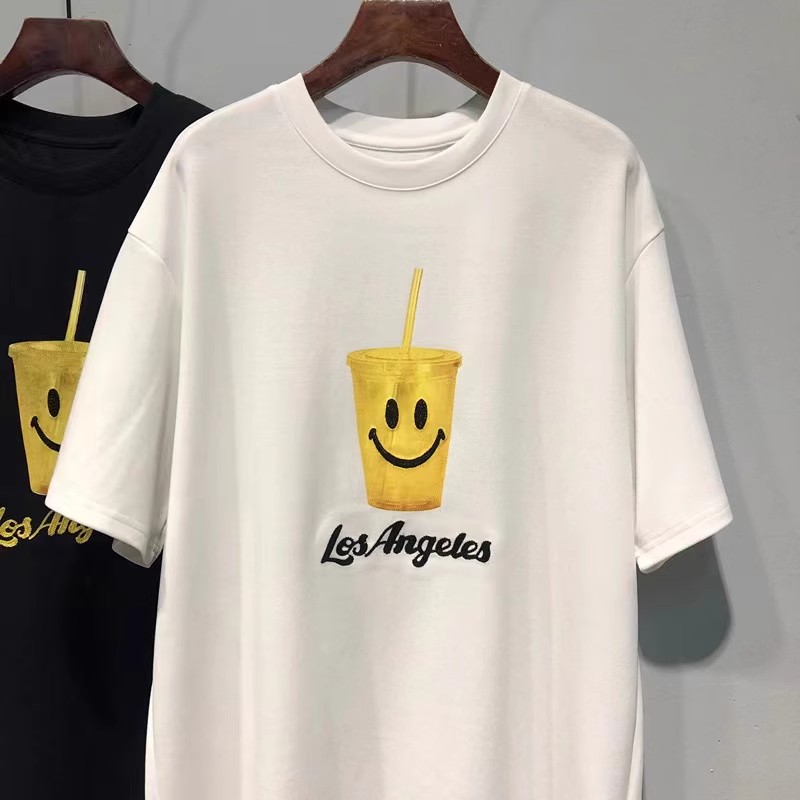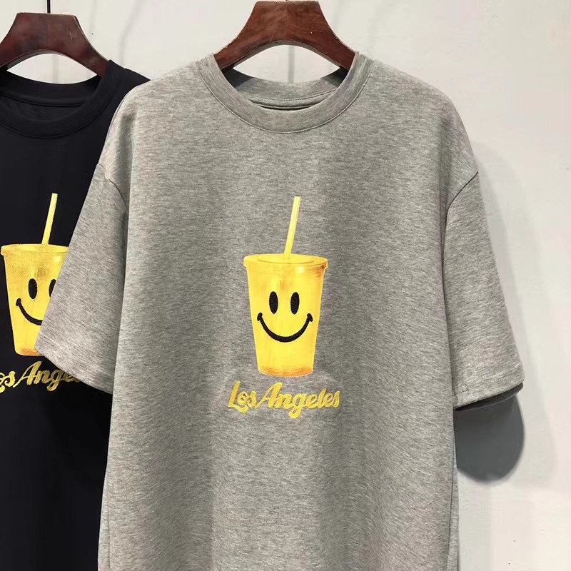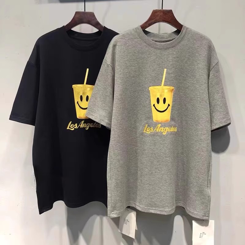 大码女装卡通印花笑脸杯子短袖T恤女夏新款休闲圆领宽松显瘦上衣