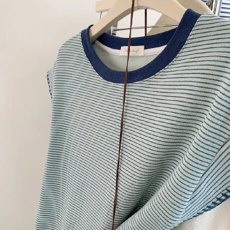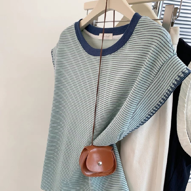 胖妹妹大码甜美条纹复古正肩t恤女2025夏季新款宽松显瘦无袖上衣
