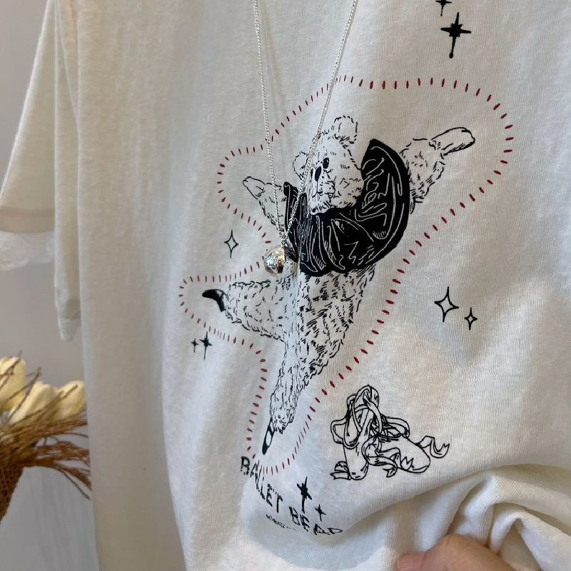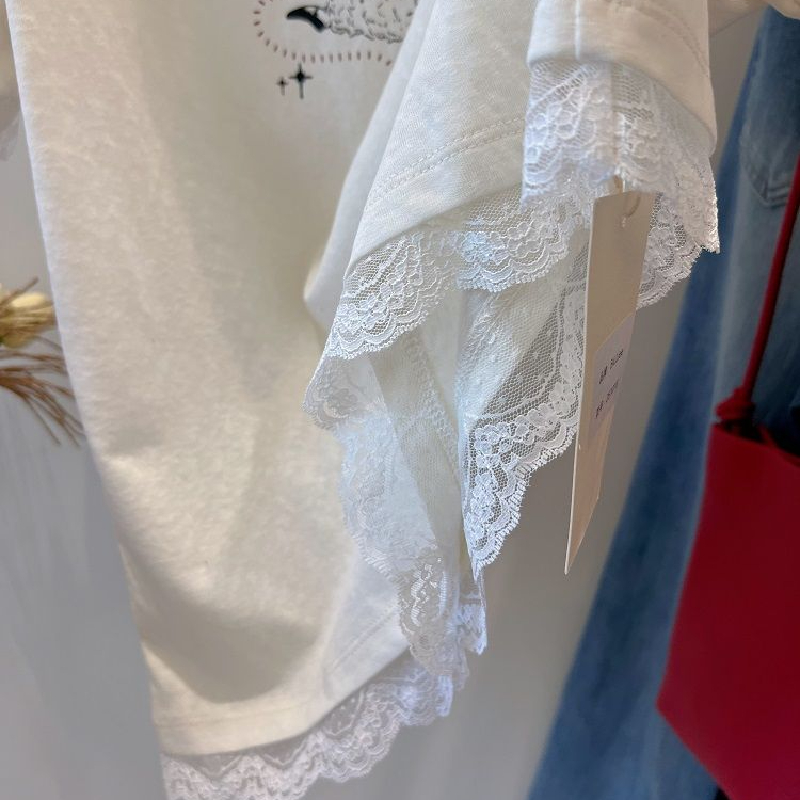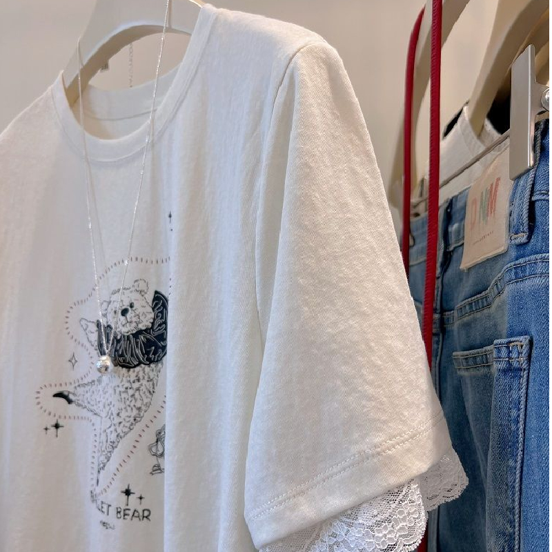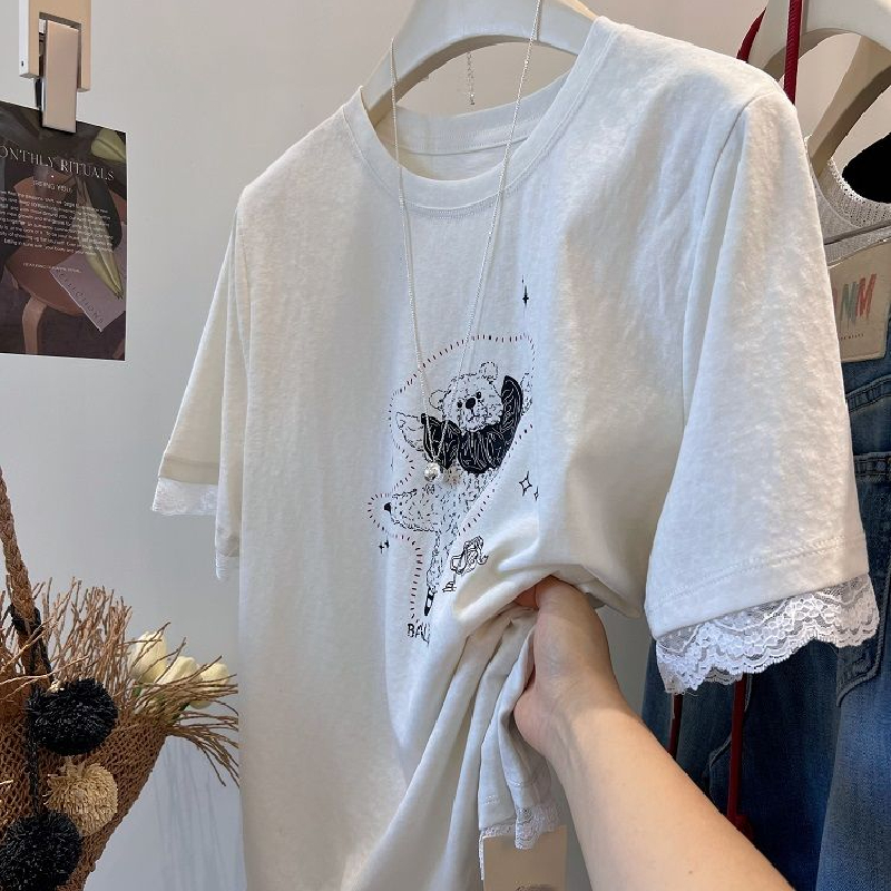 时尚简约跳舞小熊印花拼蕾丝花边短袖t恤女夏季凉爽舒适宽松上衣