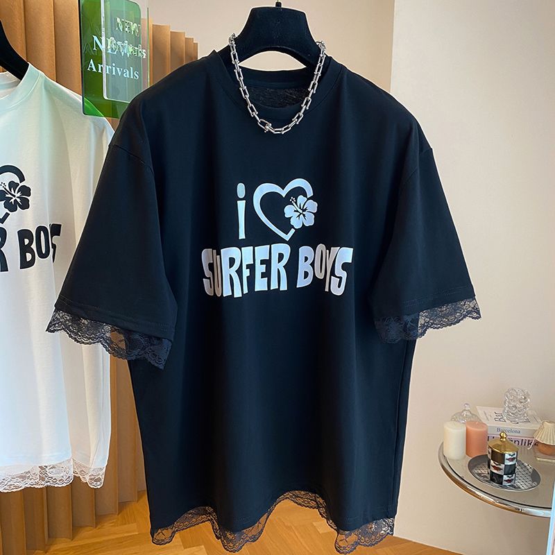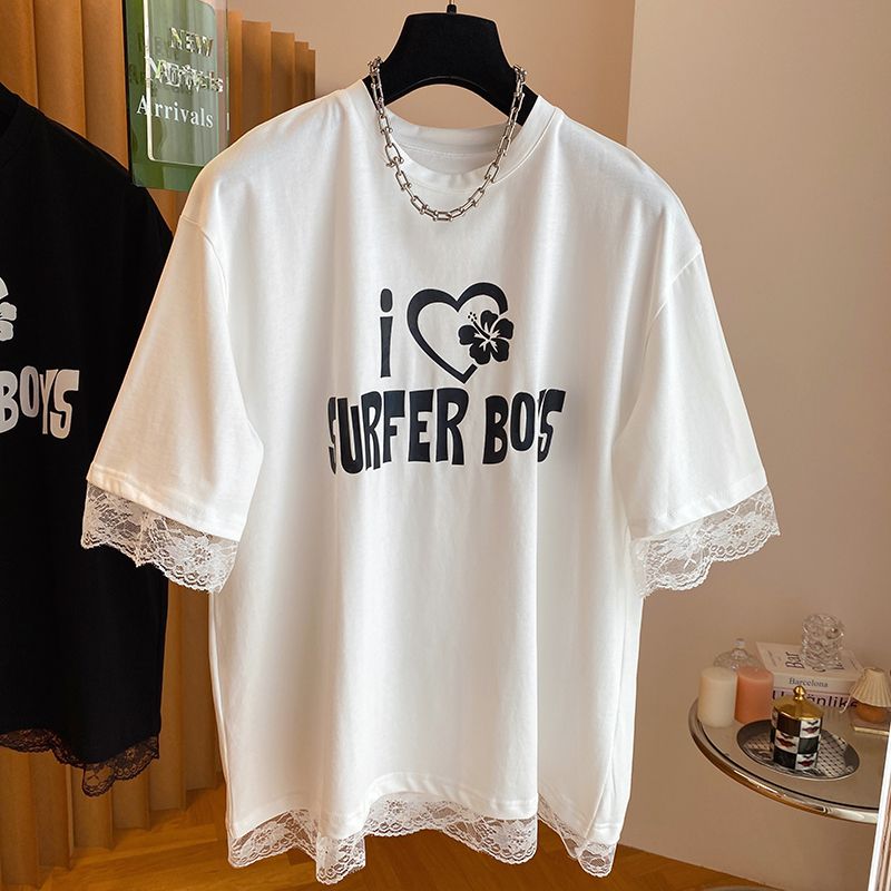 夏季胖MM小众大码蕾丝花边拼接字母短袖t恤女甜美减龄宽松体恤衫