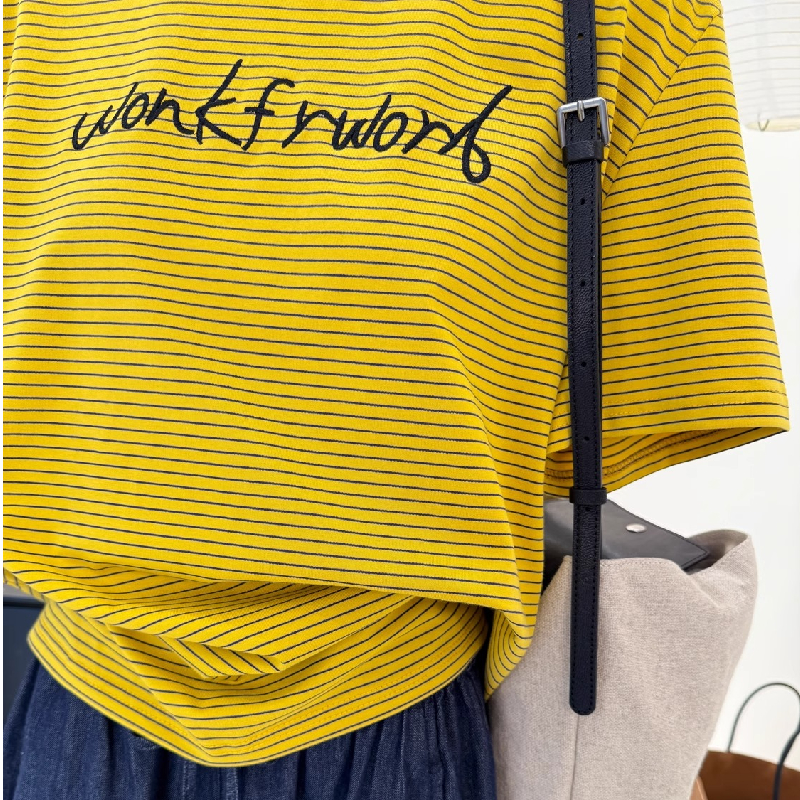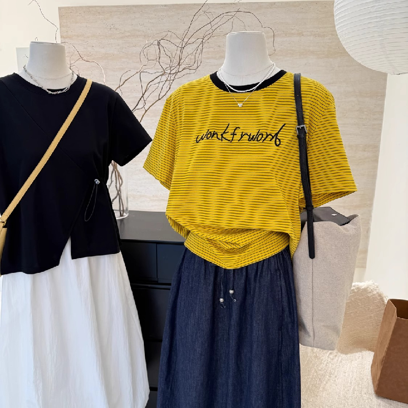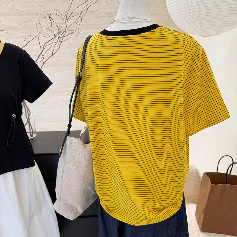 美式复古ins短袖t恤女夏季字母刺绣撞色条纹宽松显瘦圆领休闲上衣