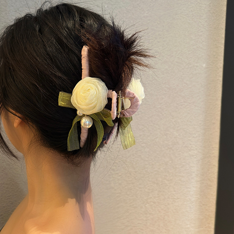 春夏新款温婉气质山茶花抓夹女甜美优雅后脑勺盘发鲨鱼夹发卡发饰