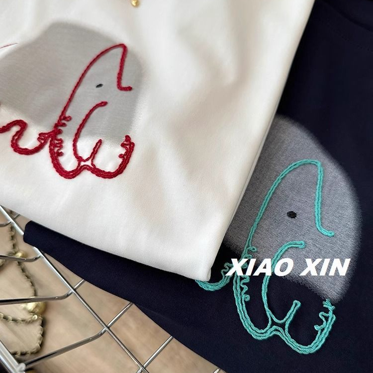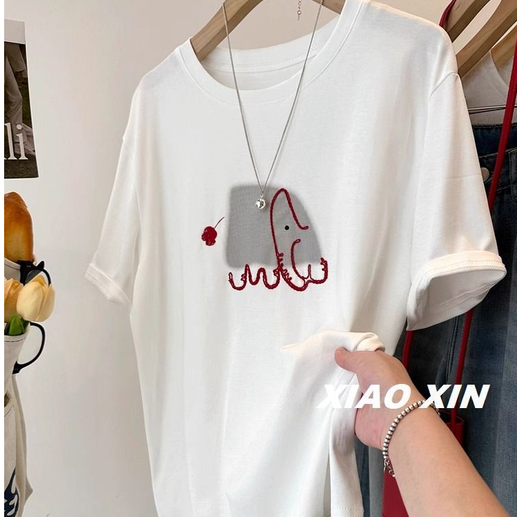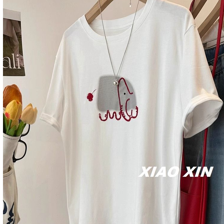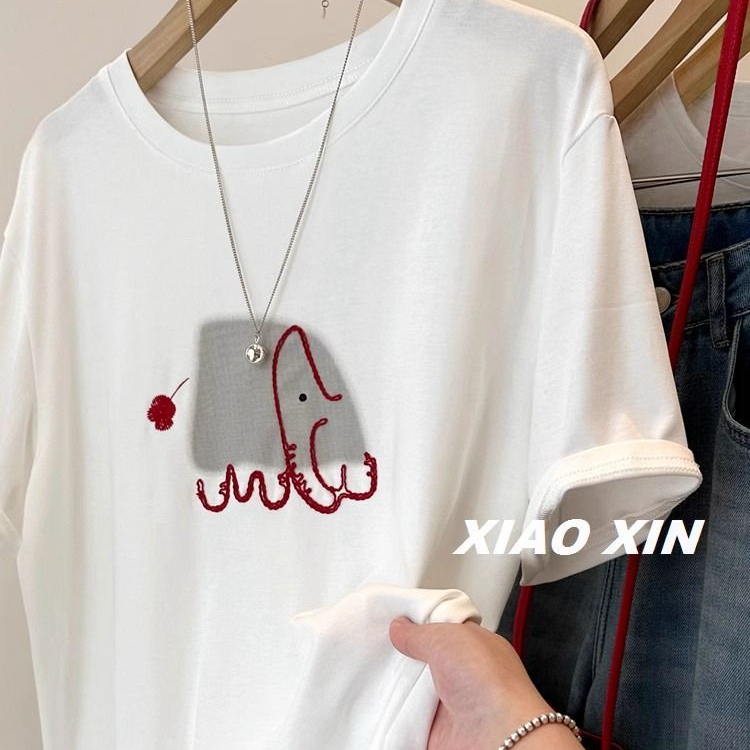 大码纯棉刺绣夏季新款韩系小象趣味短袖T恤女设计感小众减龄上衣