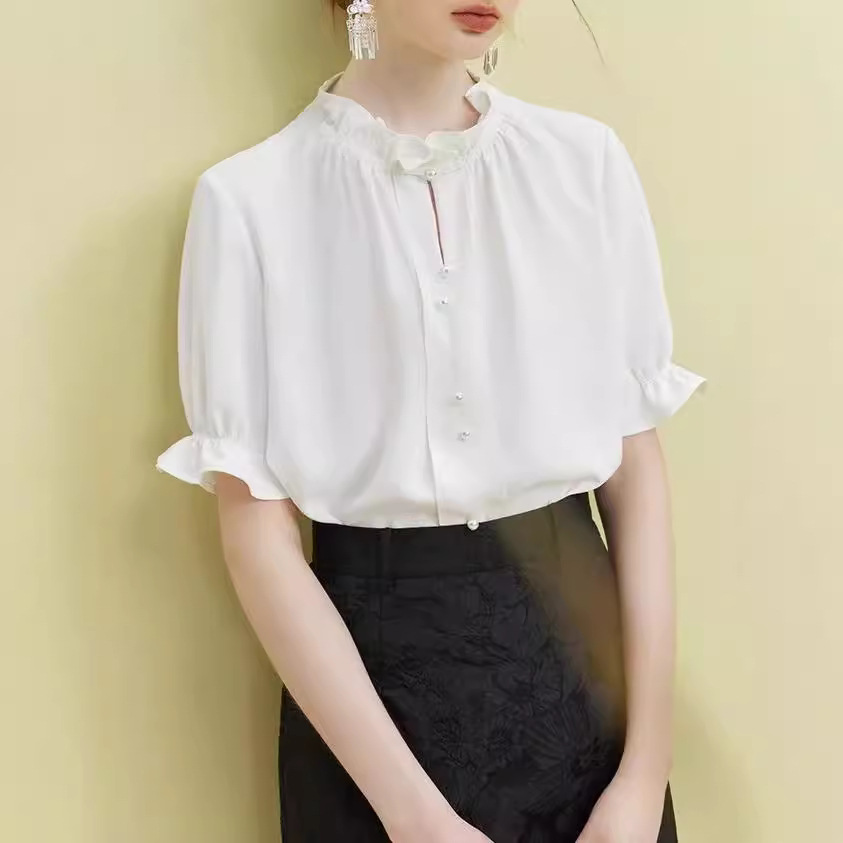 荷叶边白色短袖衬衫女夏季新中式设计感气质V领上衣