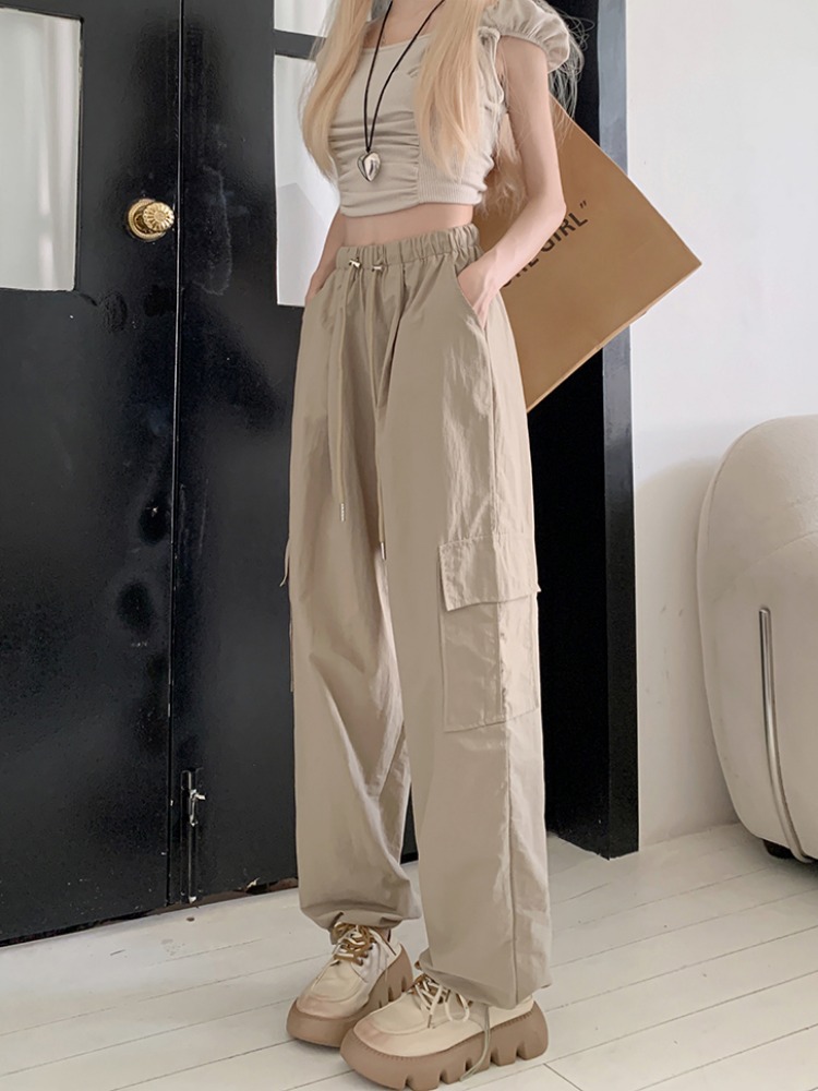 复古卡其色工装休闲裤女夏季抽绳直筒束脚裤子小个子运动阔腿长裤