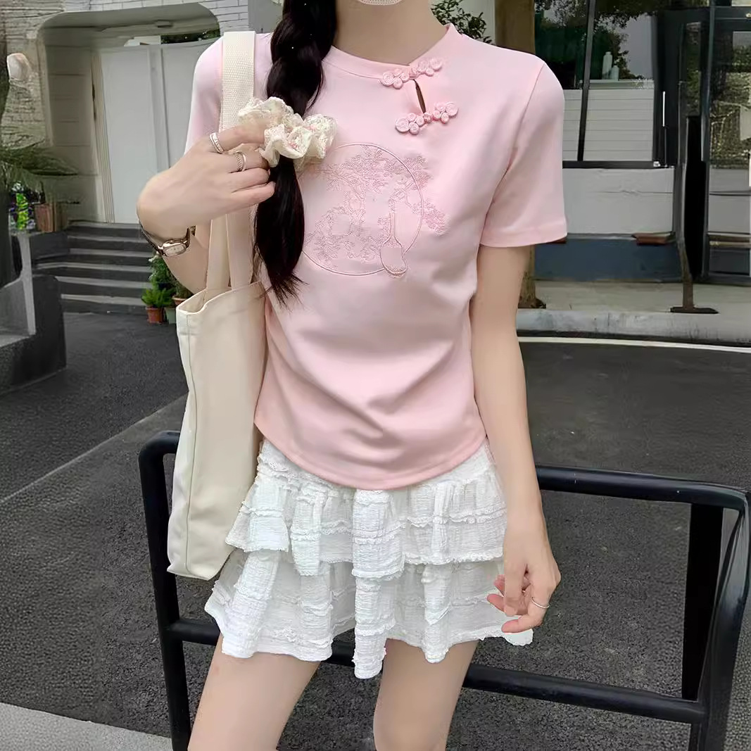 新中式国风设计感正肩短袖t恤衣女装夏潮盘扣高级感修身短款上衣