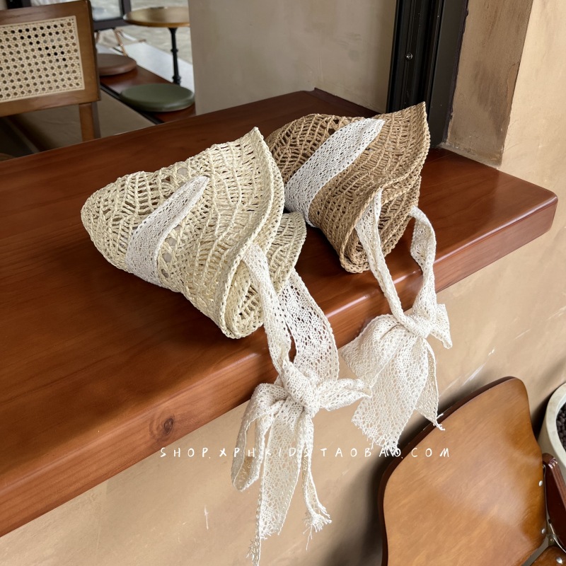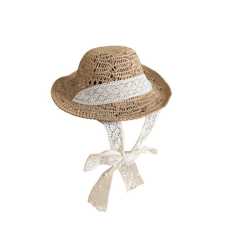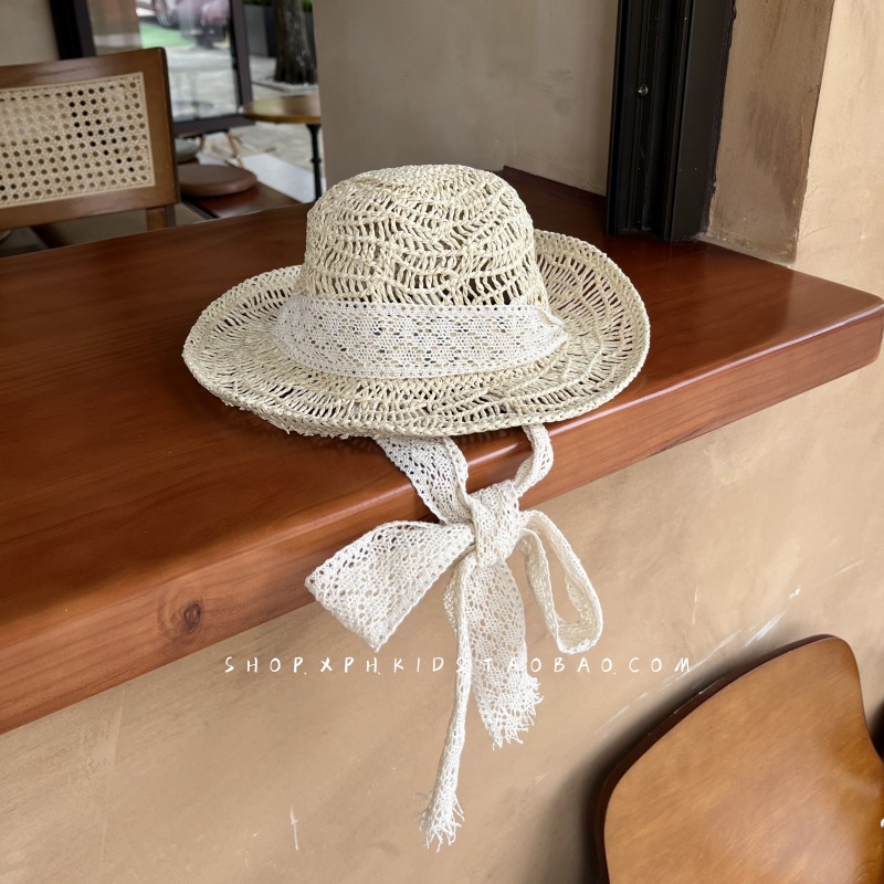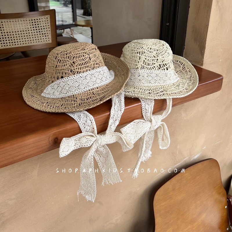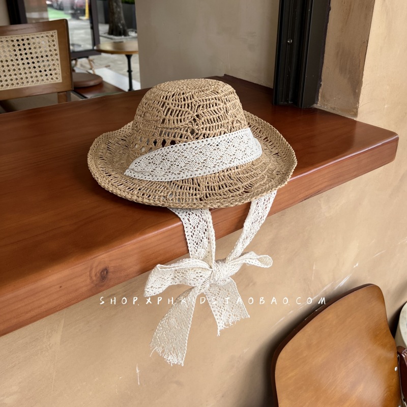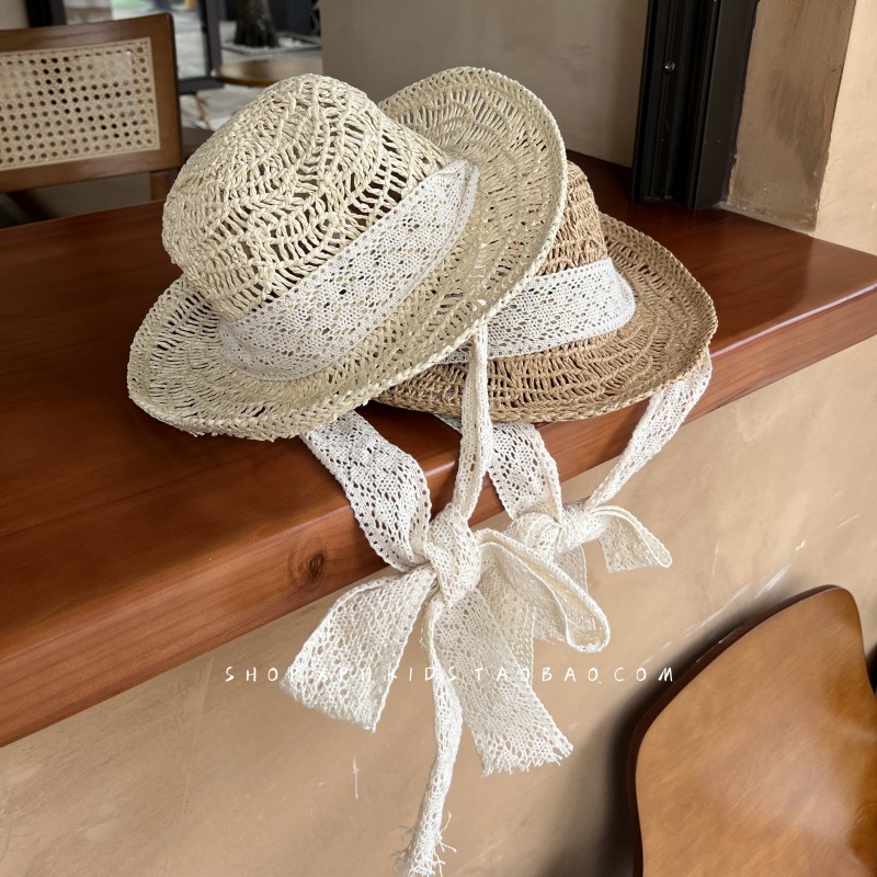 韩国ins婴幼儿童蕾丝绑带草帽夏季女宝宝防晒遮阳公主出游沙滩帽