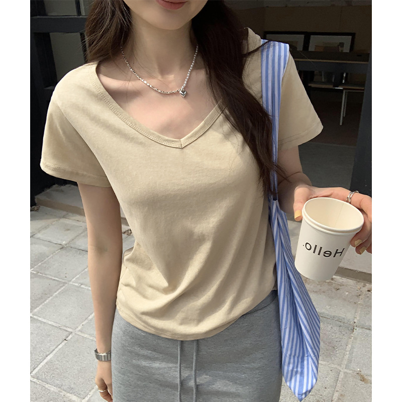 螺纹V领纯色短袖T恤女春夏新款内搭小个子体恤百搭修身上衣