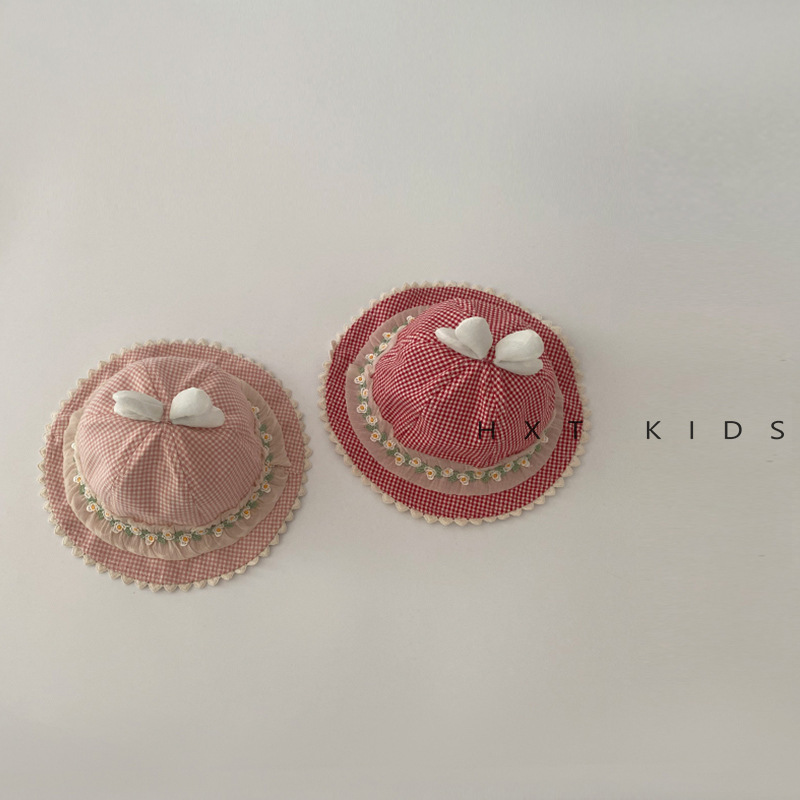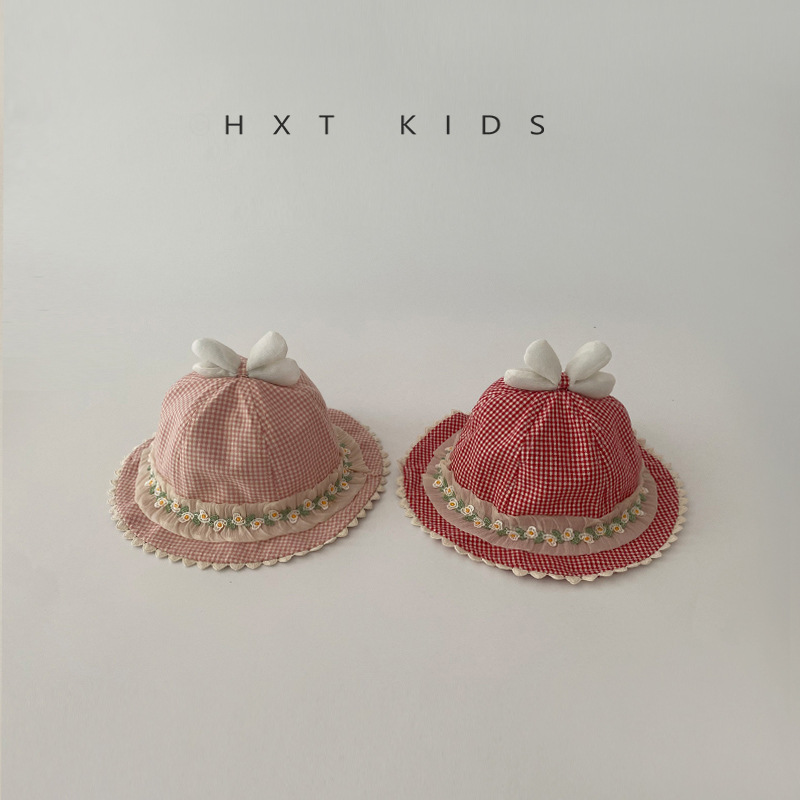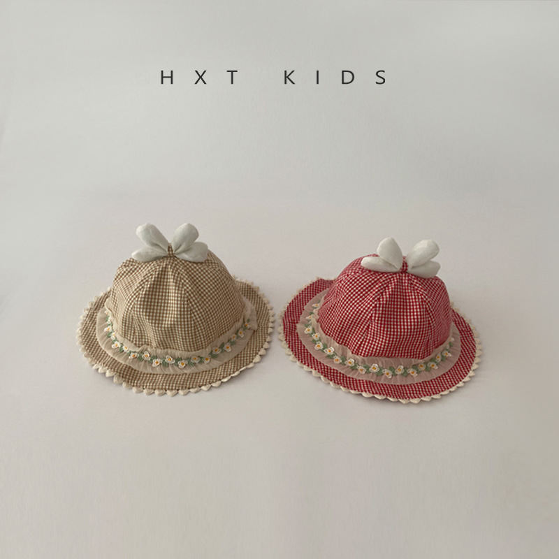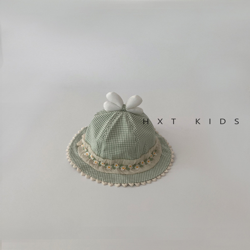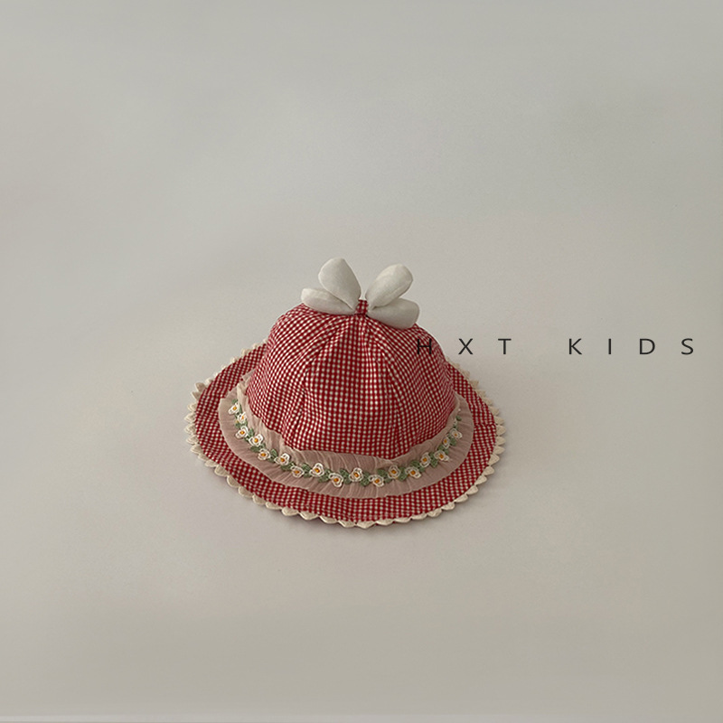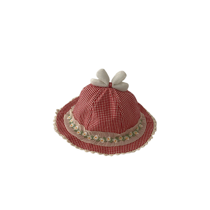 婴儿渔夫帽春秋季蝴蝶结小格纹花边遮阳帽子女宝宝夏天出游防晒帽