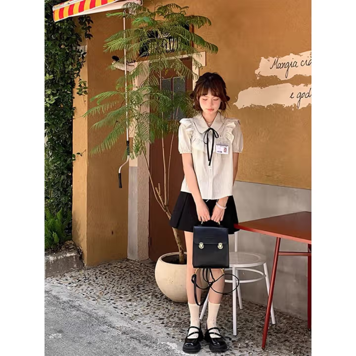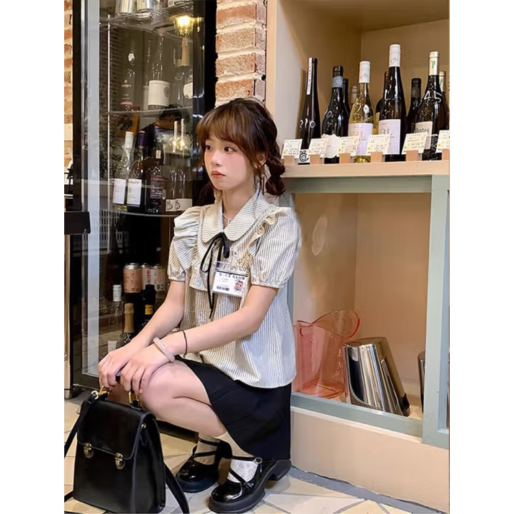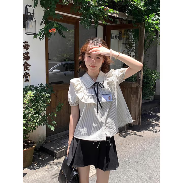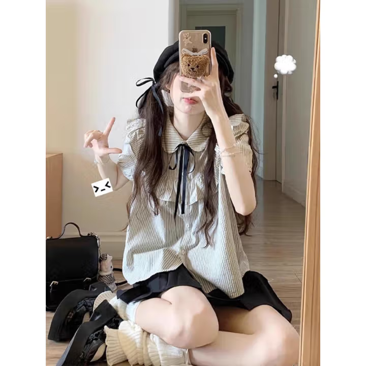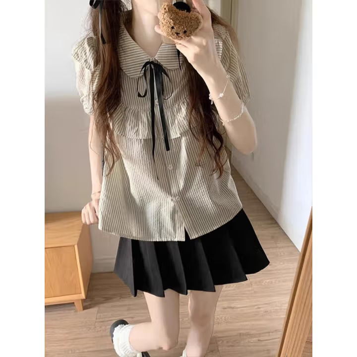 甜美学院风套装女夏娃娃领荷叶边条纹短袖衬衫半身裙短裙