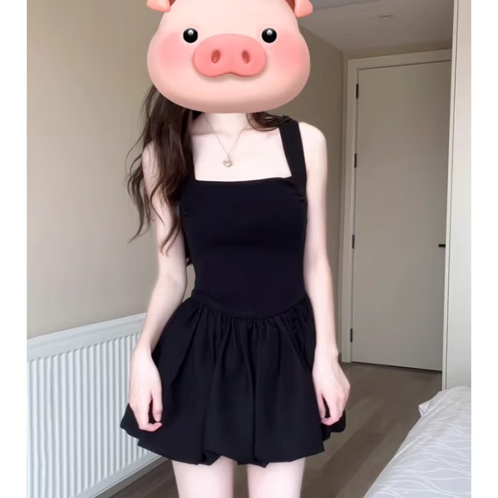 黑色无袖吊带连衣裙子女夏季法式气质甜美辣妹收腰显瘦蓬蓬短裙子