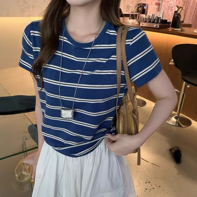 美式休闲蓝白条纹圆领慵懒宽松流行ins风潮牌T恤