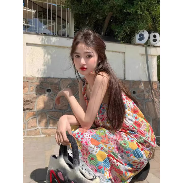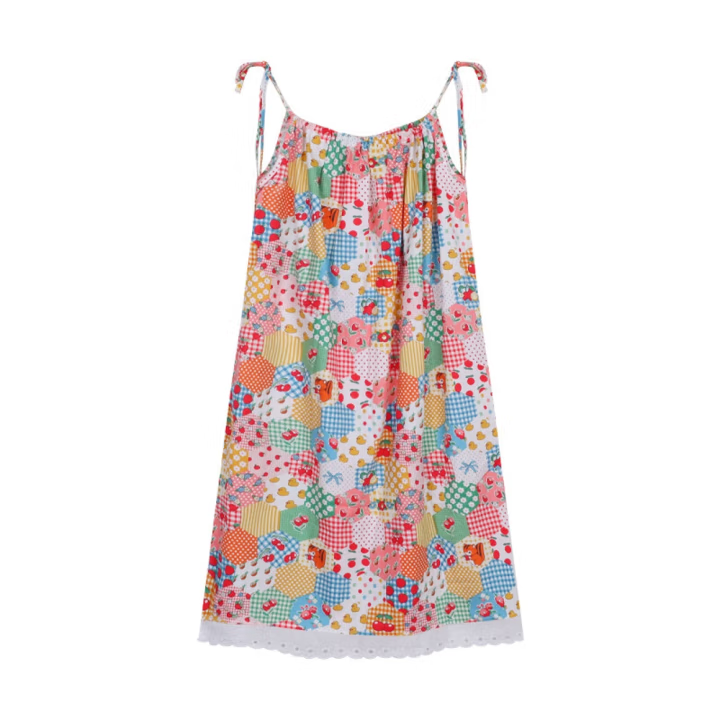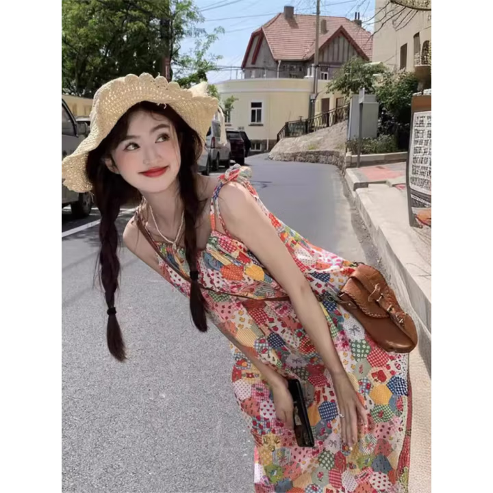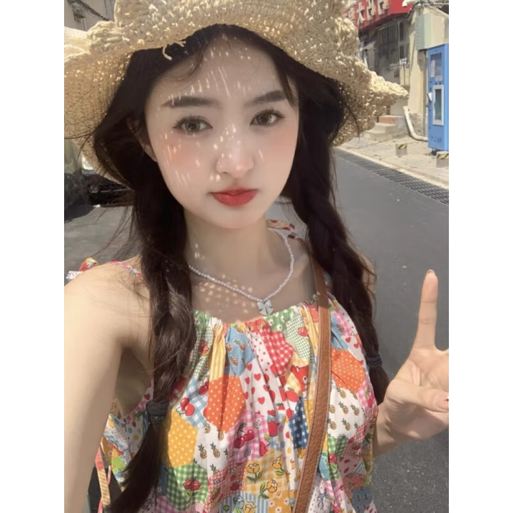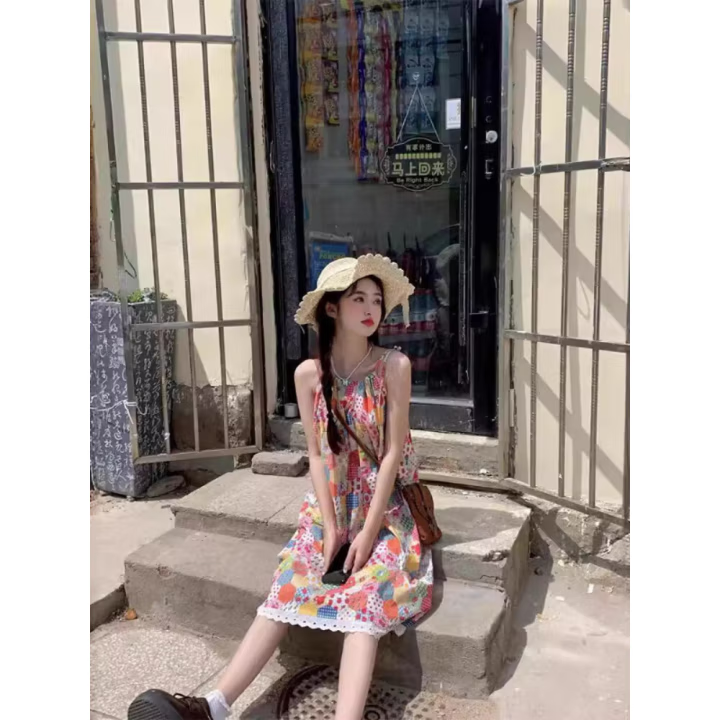 吊带连衣裙女甜美减龄可爱蕾丝花边拼接宽松海边度假绝美中长裙子