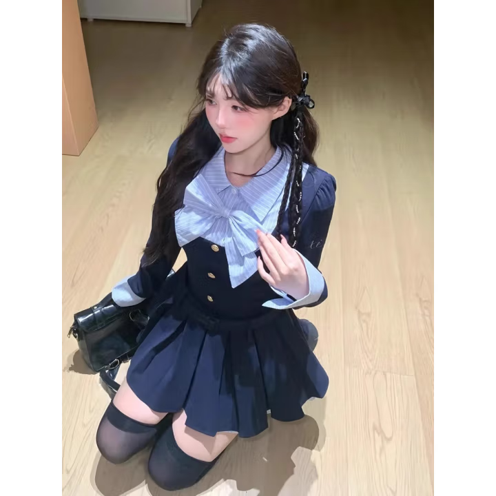 学院风甜美蝴蝶结假两件收腰连衣裙女2025小香风百褶短裙显瘦
