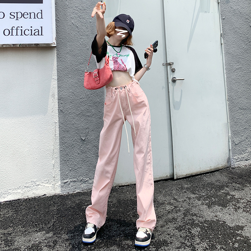 韩系抽绳休闲牛仔裤女春季新款直筒宽松显瘦彩色阔腿拖地裤