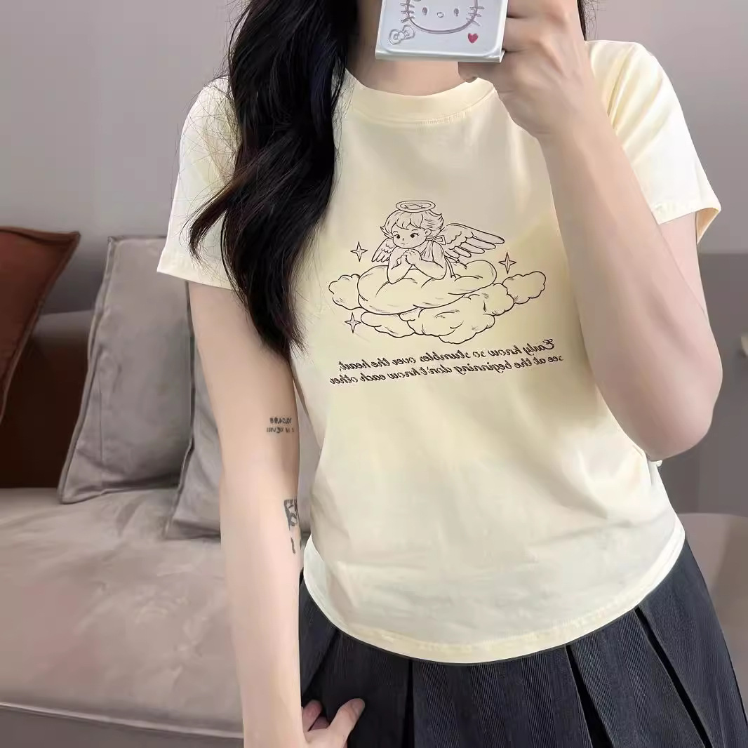 QFD正肩纯棉辣妹印花短袖T恤女夏季新款修身设计显瘦短款百搭上衣
