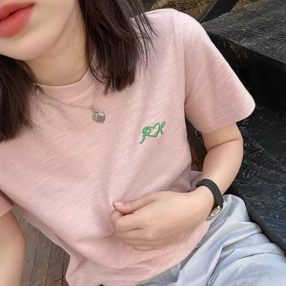 韩版清凉透气竹节棉T恤简约减龄百搭精美刺绣宽松显瘦短袖女上衣