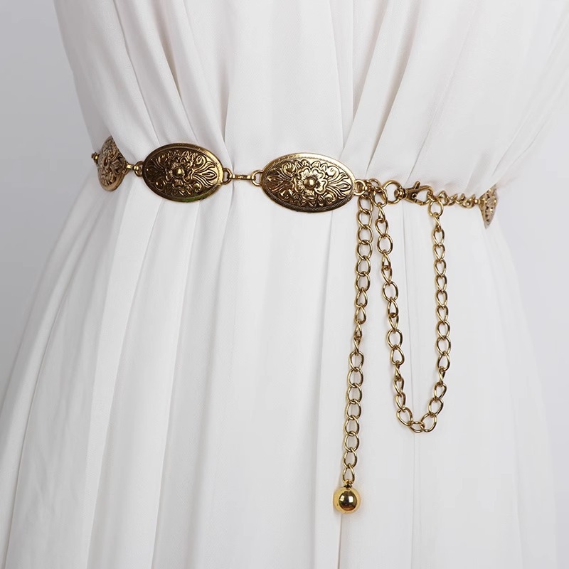 民族风椭圆雕花金属腰链女新款装饰连衣裙复古铜腰链条朋克腰带银