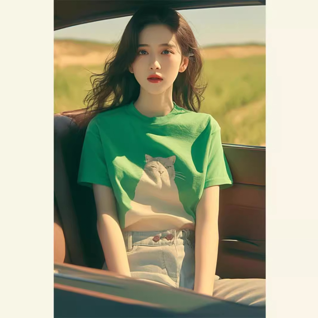 今年流行爆款韩系ins简约风独特别致甜酷显瘦减龄绿色圆领猫咪T恤