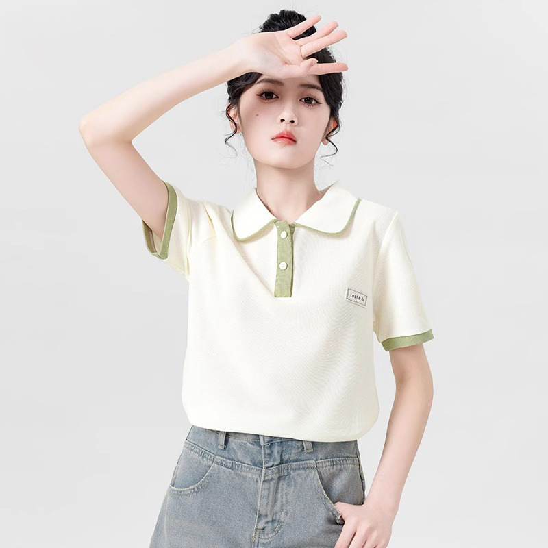 新款撞色polo领短袖T恤女夏季小清新翻领体恤娃娃领正肩上衣