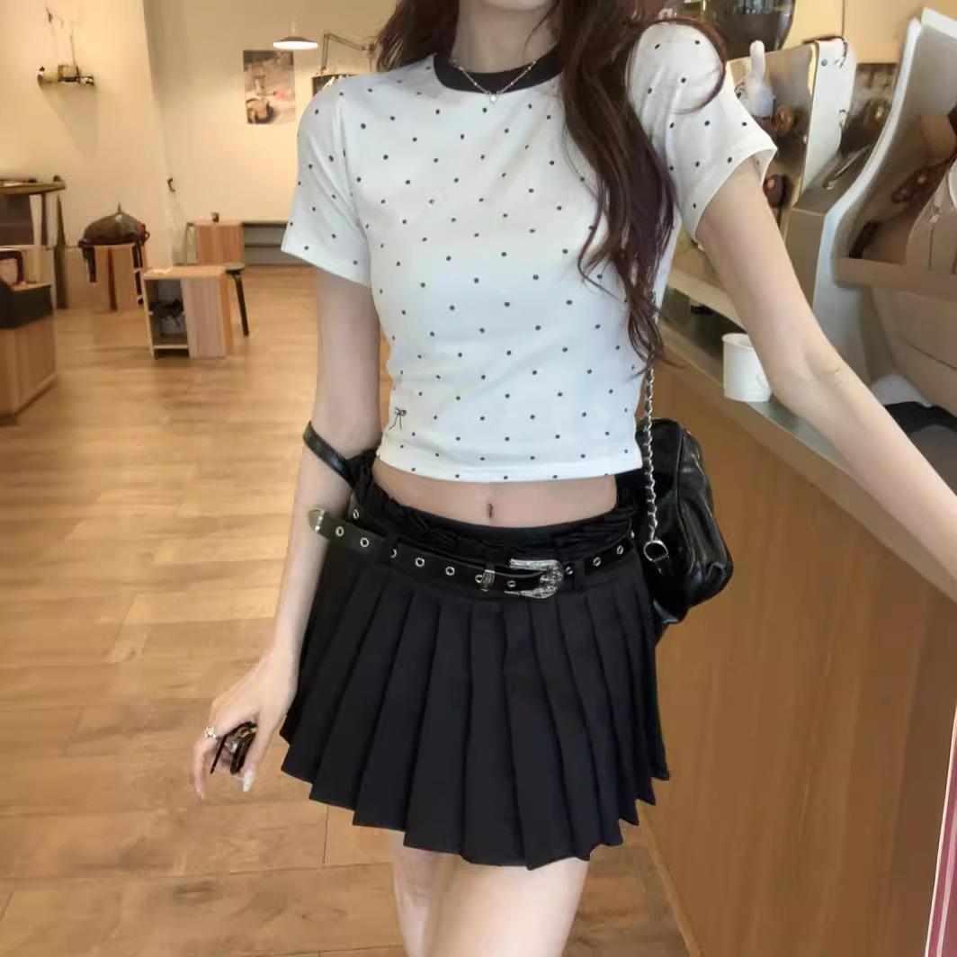 波点白色正肩短袖T恤女夏季新款bm纯欲风修身打底短款上衣