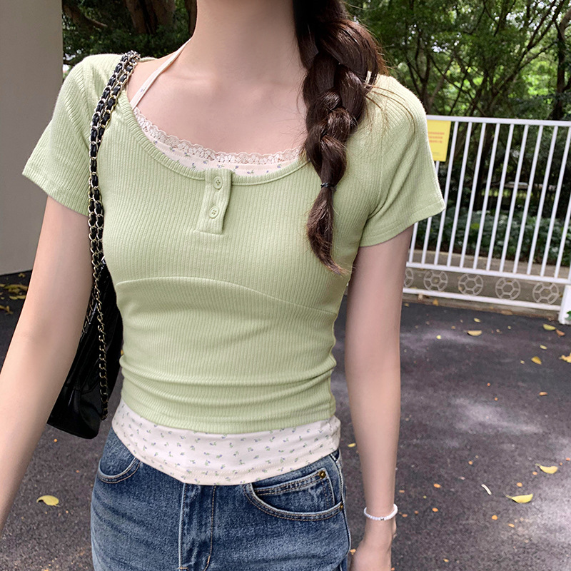 小众独特绝美碎花假两件挂脖系带短袖T恤女夏季新款修身上衣