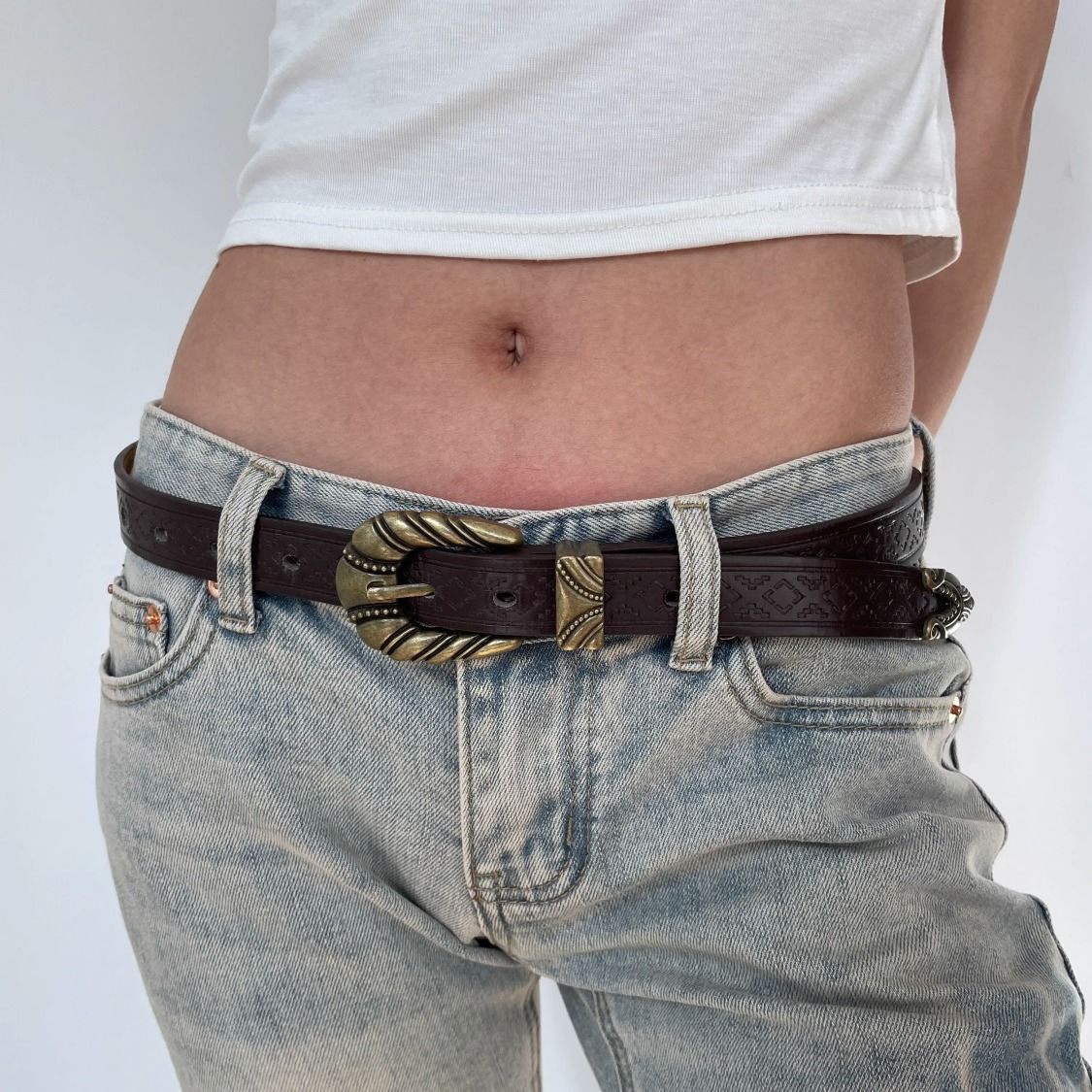 美式复古棕色压花细腰带小众设计高级感民族风y2k百搭做旧皮带