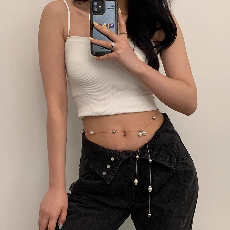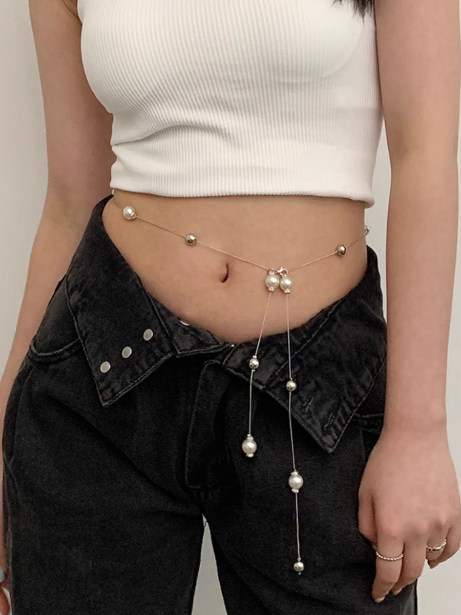 珍珠腰链女高级感甜酷少女装饰连衣裙身体链蹦迪可调节肚脐链腰带