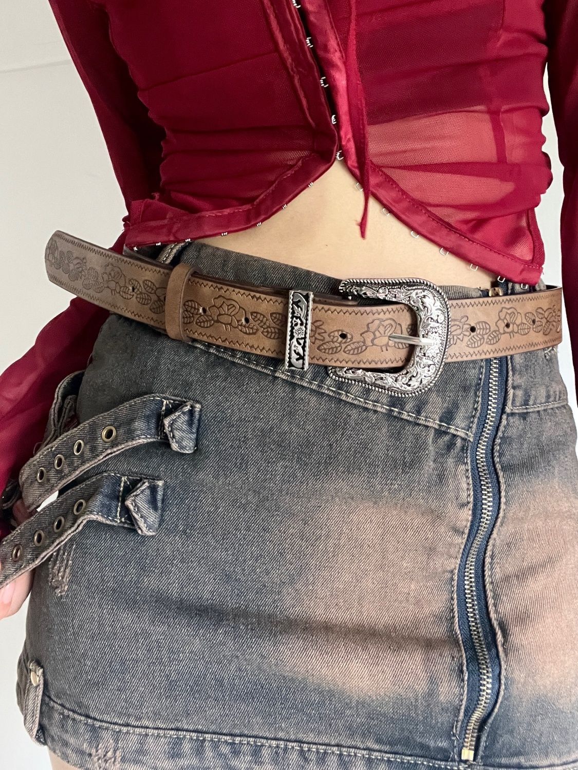 复古文艺民族风做旧质感印花腰带棕色个性青古铜扣压花百搭腰带
