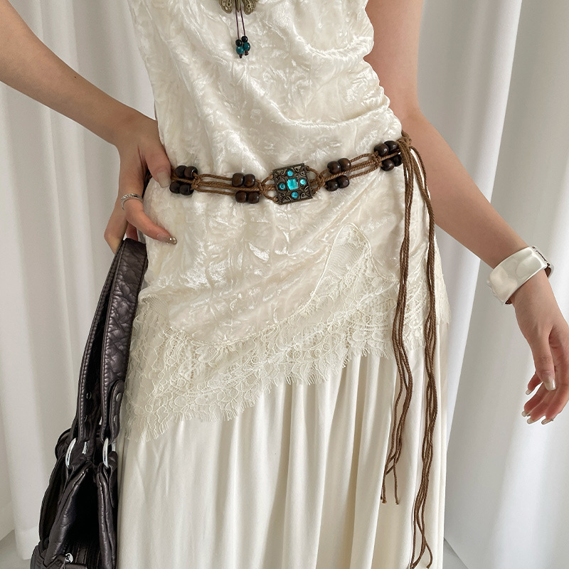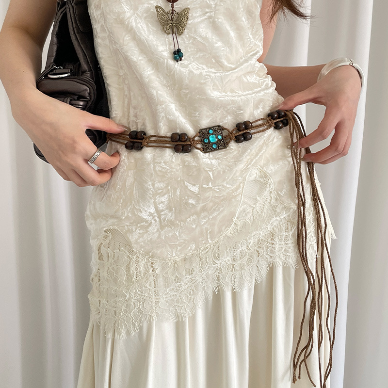 波西米亚编织腰带女复古设计感串珠民族风腰绳配连衣裙子皮带装饰